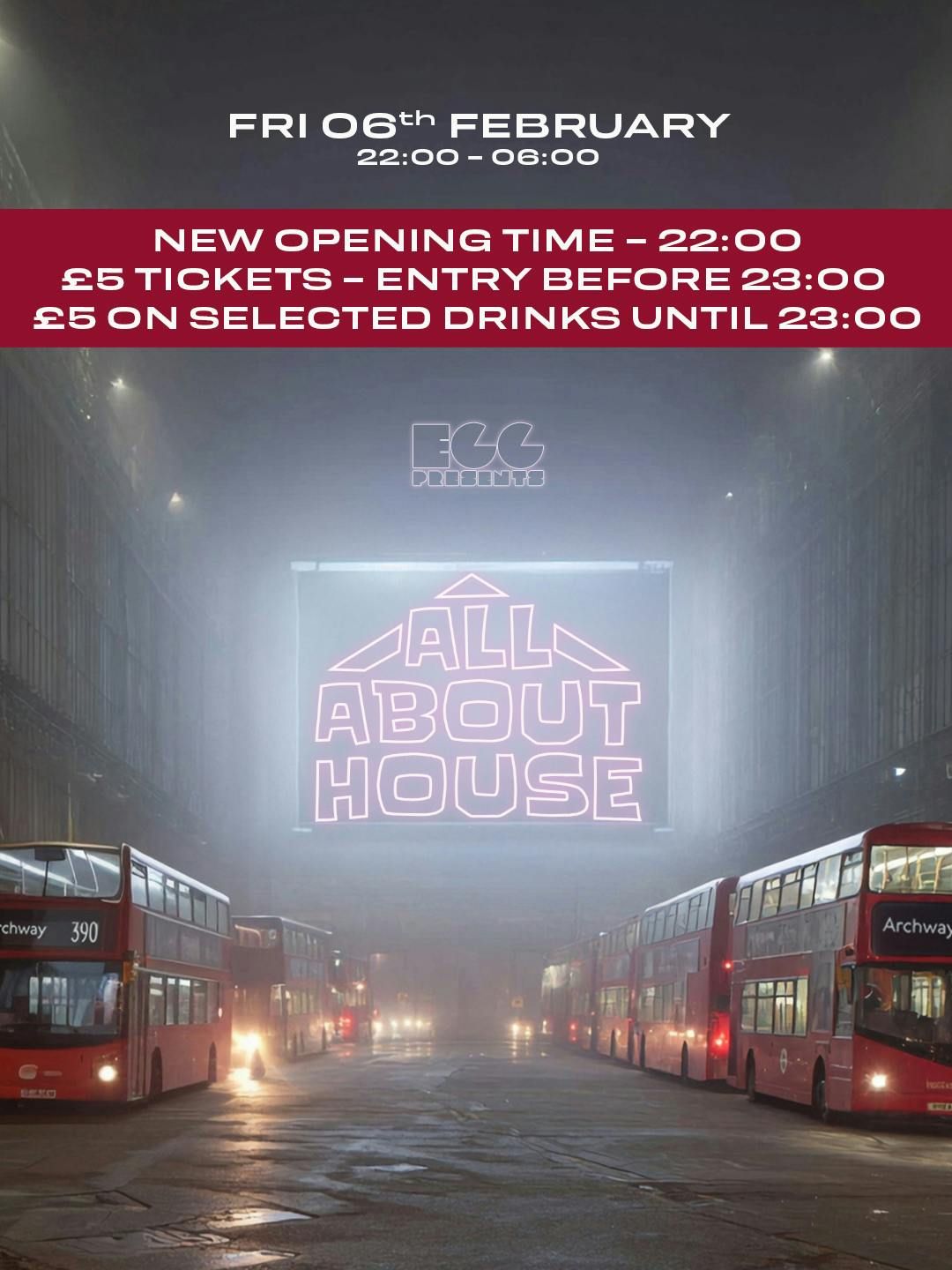 Friday 6th February – All About HouseAll About House returns in 2026 with a new format and an even sharper focus on pure House energy. We’re opening earlier, with doors at 10:00pm, setting the tone for a full night of grooves and deeper sounds from the moment you walk in.Enjoy £5 entry before 11pm and selected drinks for £5 until 11pm. Egg will be open late as usual, with last entry at 5am.