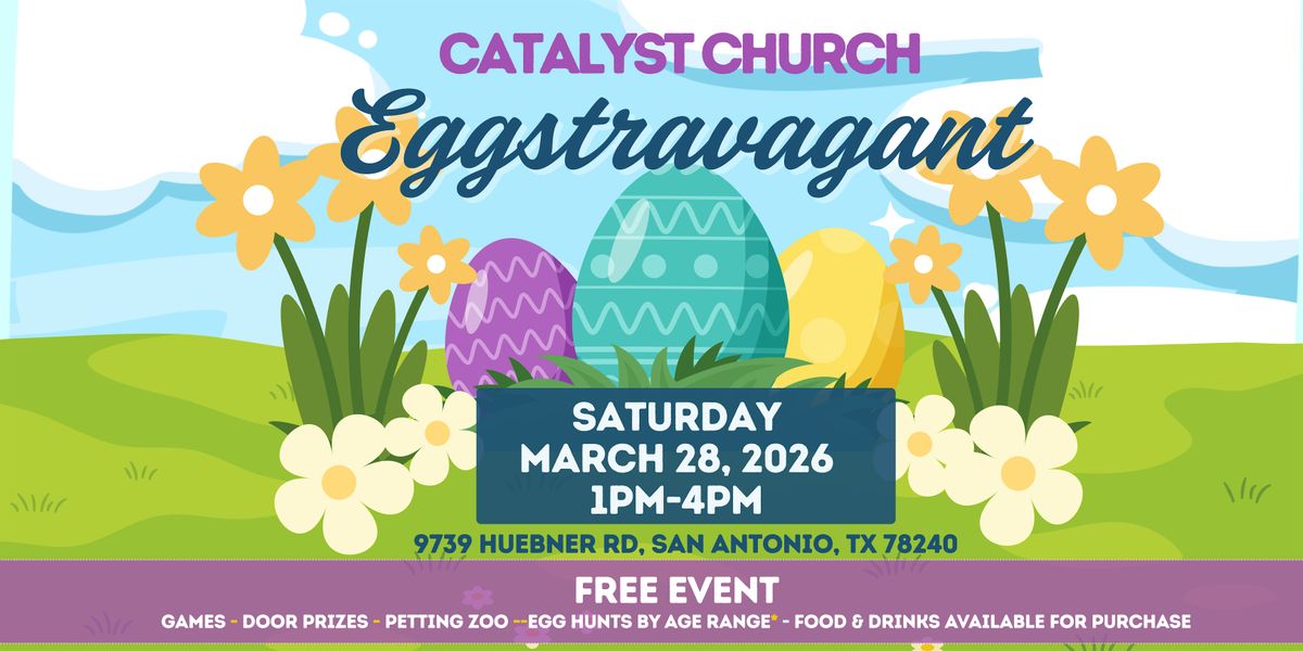 Join Catalyst Church SA for our FREE Annual Easter Egg Hunt for the whole family on Saturday, March 28, 2026 from 1PM-4PM @ 9739 Huebner Road, San Antonio, TX 78240. We will have giveaways, games, Easter Egg Hunts, food avilable for purchase, free petting zoo, and more! Register here for a chance to win a prize!