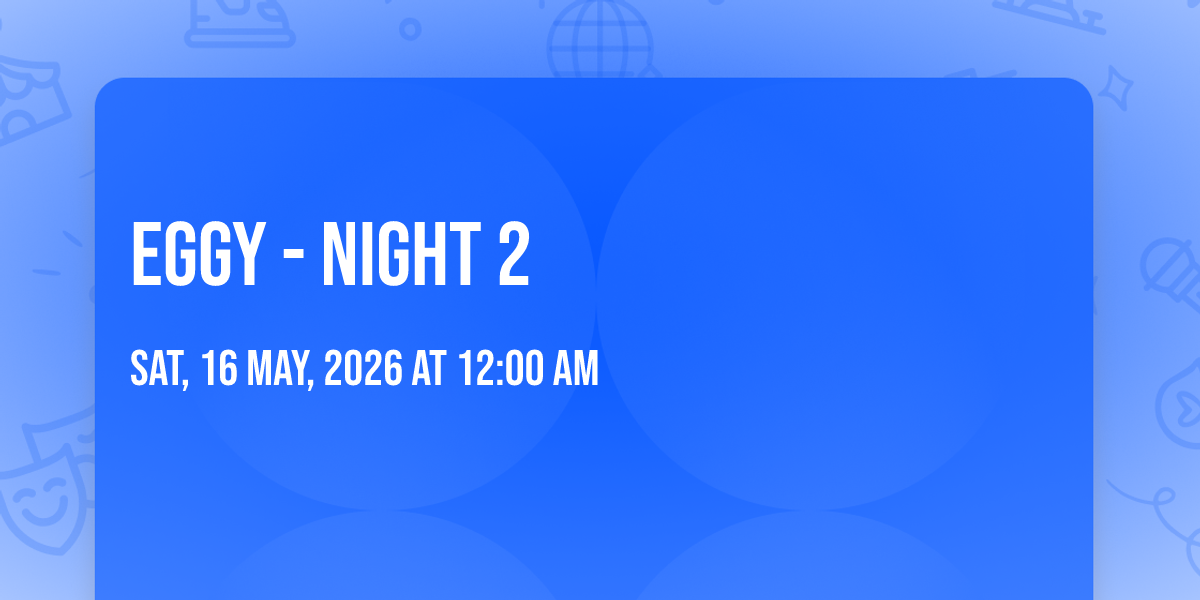 📍 Location: 43.0797, -70.763🎉 Welcome to Eggy - Night 2, where the impossible becomes possible and dreams take flight! 🏛️ Join us at 3S Artspace in the heart of Portsmouth, NH for an event that will redefine your expectations. 📅 On May 16th, 2026 at 12:00 AM, witness the transformation of space and time into something truly magical. ✨ It's a curated experience combining the best of innovation, entertainment, and community spirit, creating moments that will be remembered for years to come. Whether you're a first-time visitor or a seasoned enthusiast, prepare to be amazed. 🎊 Book now to ensure your place in this unforgettable experience!