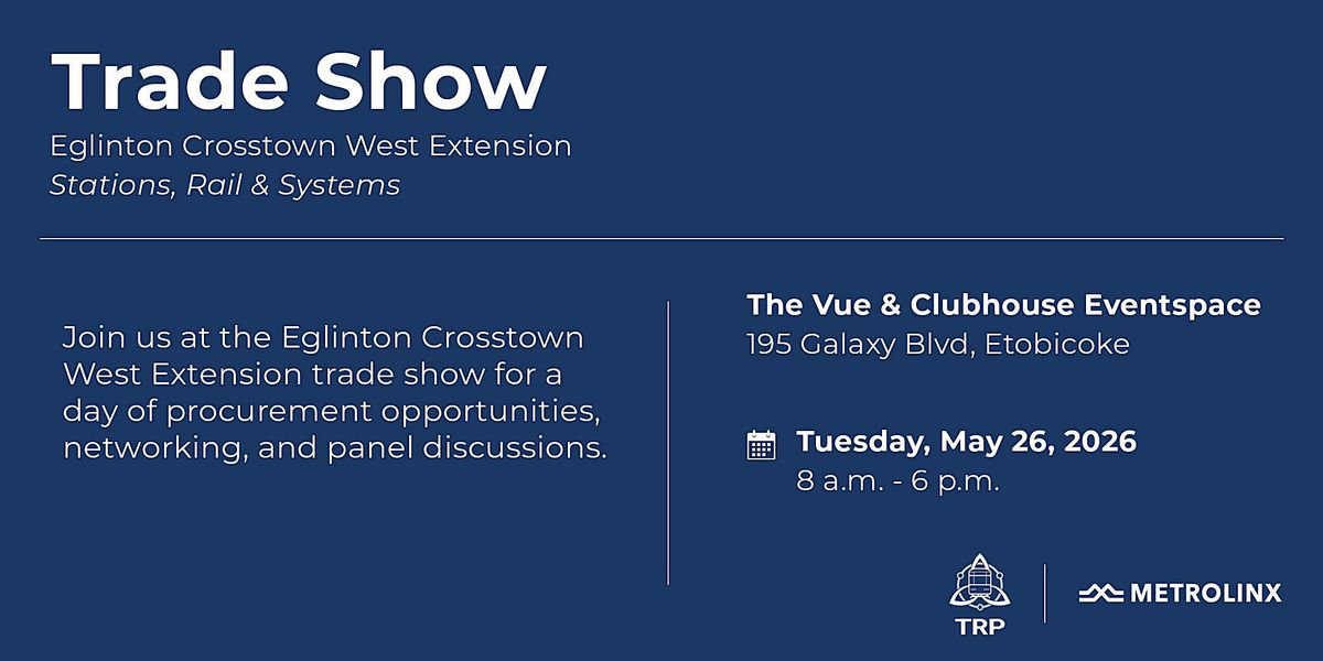 Trillium Rail Partners (TRP), in partnership with Metrolinx, invites you to attend the Eglinton Crosstown West Extension Trade Show—a full-day dedicated to connection, opportunity, and collaboration. This event brings together industry partners, local businesses, job seekers, and community organizations to explore procurement opportunities and career pathways tied to the Eglinton Crosstown West Extension Stations, Rail and Systems (ECWE SRS) project.