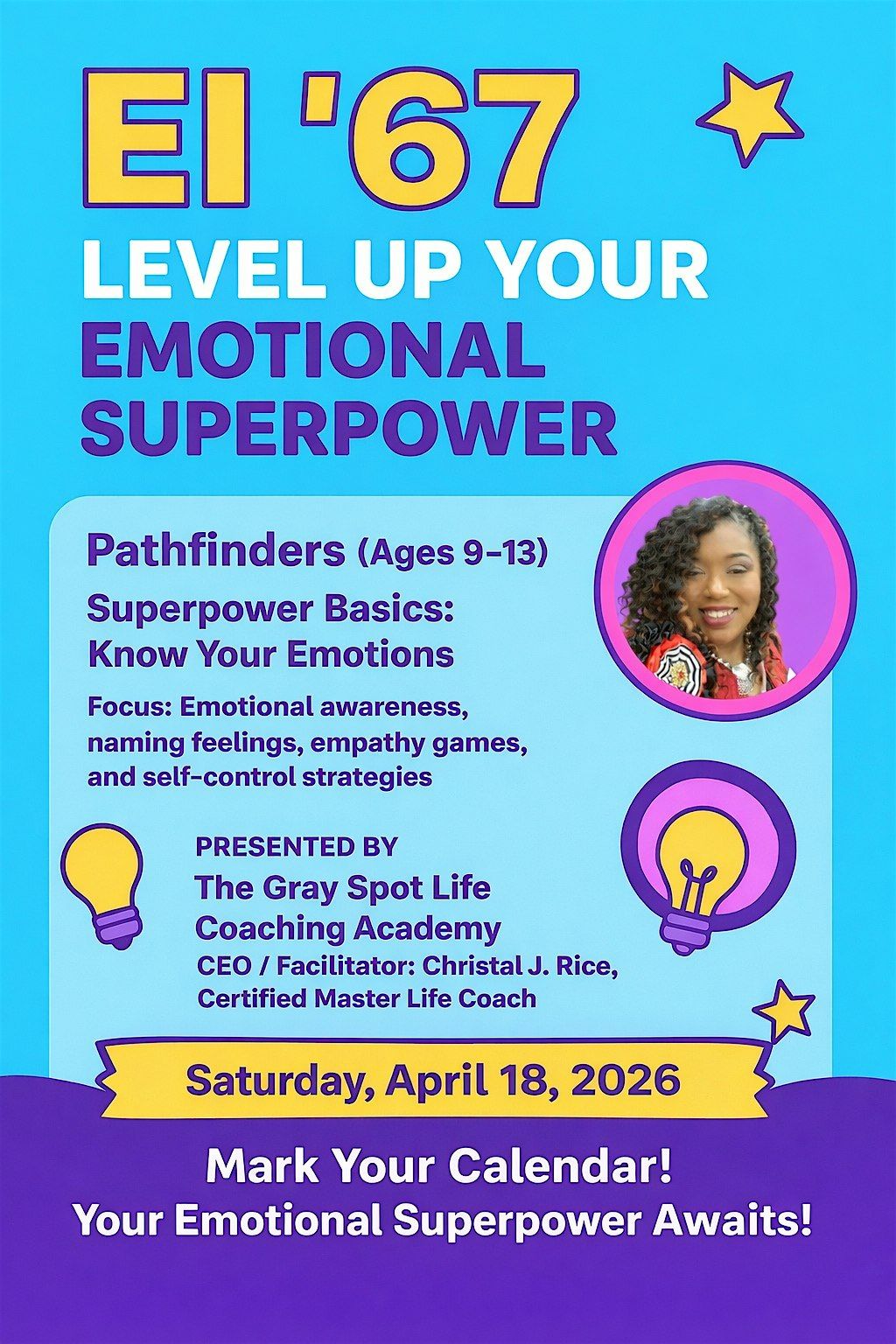 Welcome to the EI'67 Emotional Intelligence Workshop! Join us at the Five Forks Branch Library on February 7, 2026 at 10:00 AM (Eastern Time) to enhance your young person's emotional intelligence skills. This interactive workshop will provide practical tools and strategies to navigate emotions effectively in both personal and professional settings. (AGES : 9-13) Don't miss this opportunity to develop your emotional awareness and build stronger relationships. See you there! Food will be served. once you have registed and purchased your ticket,you will receive a parental consent form. * PARENTAL CONSENT FORM IS REQUIRED * After purchase, a link to the consent form will be emailed and MUST be completed per child!!! Cost is $15.00 per child; 2nd child is $10.00 ( Siblings) USe code 2NDCHILD at checkout!