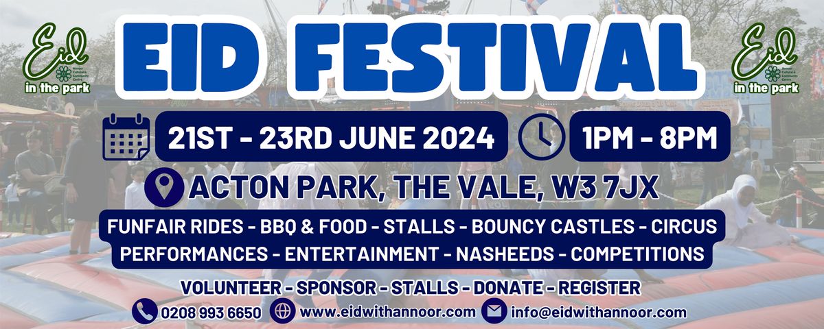 Come and celebrate Eid ul Adha with your friends and family at our 3 day Eid in The Park with Annoor event, in the heart of Acton Park. Our last event saw over 2,000 of you coming together to celebrate Eid with us. Lets do it all over again!