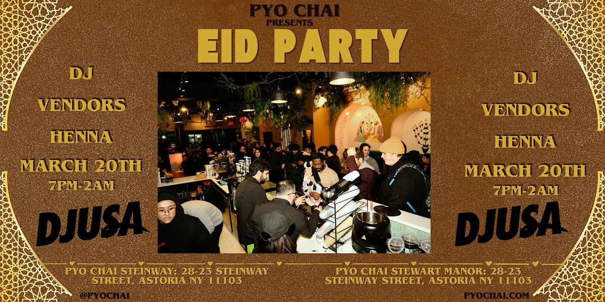 Get ready to celebrate Eid with us at PYO Chai! Join the fun on March 20, 2026 at 7:00 PM (ET) for an evening full of good vibes, tasty chai, and great company. DJ USA will be spinning records all nights, and Jahan Fragrances will be setting up a live Perfume Bar! Whether you're here to chill or dance, this party's got you covered. Don't miss out on an awesome night to connect and celebrate together!