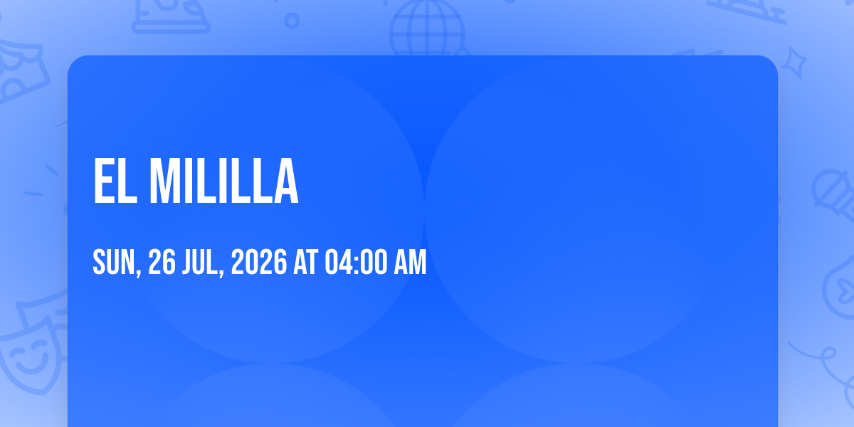 📍 Location: 34.0446, -118.265✨ Experience the magic of El Mililla, where moments become memories that last a lifetime! 🏛️ The iconic The Novo in Los Angeles, CA sets the perfect stage for an unforgettable celebration on July 26th, 2026 at 04:00 AM. 🌟 It's been a curated experience that brings together the best of entertainment and innovation, creating an atmosphere of wonder and excitement. From the moment you arrive, you'll be immersed in a world where the ordinary transforms into the extraordinary. 🎊 Book early to secure your place in what promises to be an event that will be talked about for years to come!