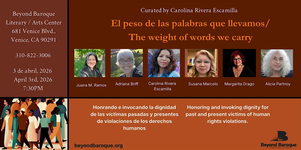 Organizado por Carolina Rivera Escamilla, esta conversación une a escritoras honrando la dignidad de las victimas pasadas y presentes de violaciones de los derechos humanos. «El peso de las palabras que llevamos», se alude a la responsabilidad que conlleva la transmisión de los principios de dignidad adquiridos a través de la vida en comunidad, legados por aquellos que ya han transcendido. Los muertos no se han desvanecido, sino que han quedado inmortalizados en nuestras narrativas. Este presente nos ofrece una visión de un futuro que ellos vislumbraron y por el cual entregaron su vida con el propósito de evitar la realidad actual. Participan: Juana M. Ramos, Adriana Briff, Carolina Rivera Escamilla, Susana Marcelo, Margarita Drago, and Alicia Partnoy.