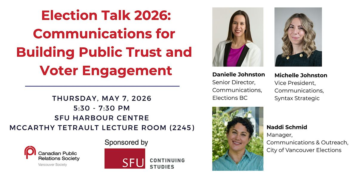 This lively panel discussion will feature Natti Schmid (City of Vancouver Elections), Danielle Johnston (Elections BC), and Michelle Johnston (Syntax Strategic).