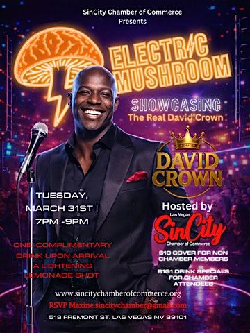 The Sin City Chamber of Commerce proudly presents Electric Mushroom, an exciting live comedy showcase featuring The Real David Crown — bringing laughter, entertainment, and unforgettable vibes to Fremont Street.