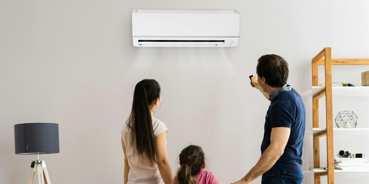 Image: Two adults and a child stand in a living room facing a wall-mounted air conditioner, one pointing a remote control