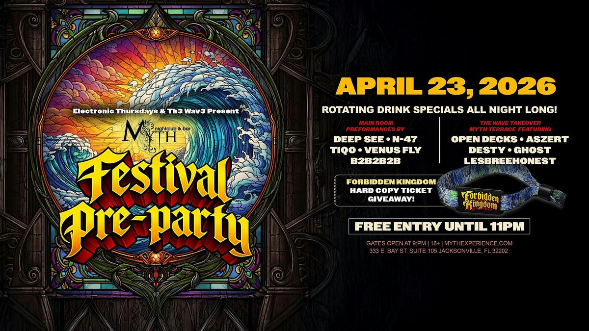 Join us at Myth Nightclub & Bar for a high-energy Festival Pre-Party celebrating the return of festival season with a night full of electronic music, DJs, drink specials, and a chance to win tickets to Forbidden Kingdom Festival.