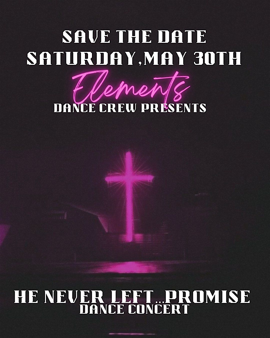 Join us for a beautiful night with Elements Dance Crew sharing their artistry through praise and worship! He Never Left…Promise Showcase will be highlighting how God has been with us through everything. We will be bringing in dancers from different backgrounds to join together for one purpose. Don't miss out on this vibrant display of talent and passion – it's the perfect chance to see how the Lord has moved in our life and we would like to share that with you. Invite your friends and family for a night to remember!!