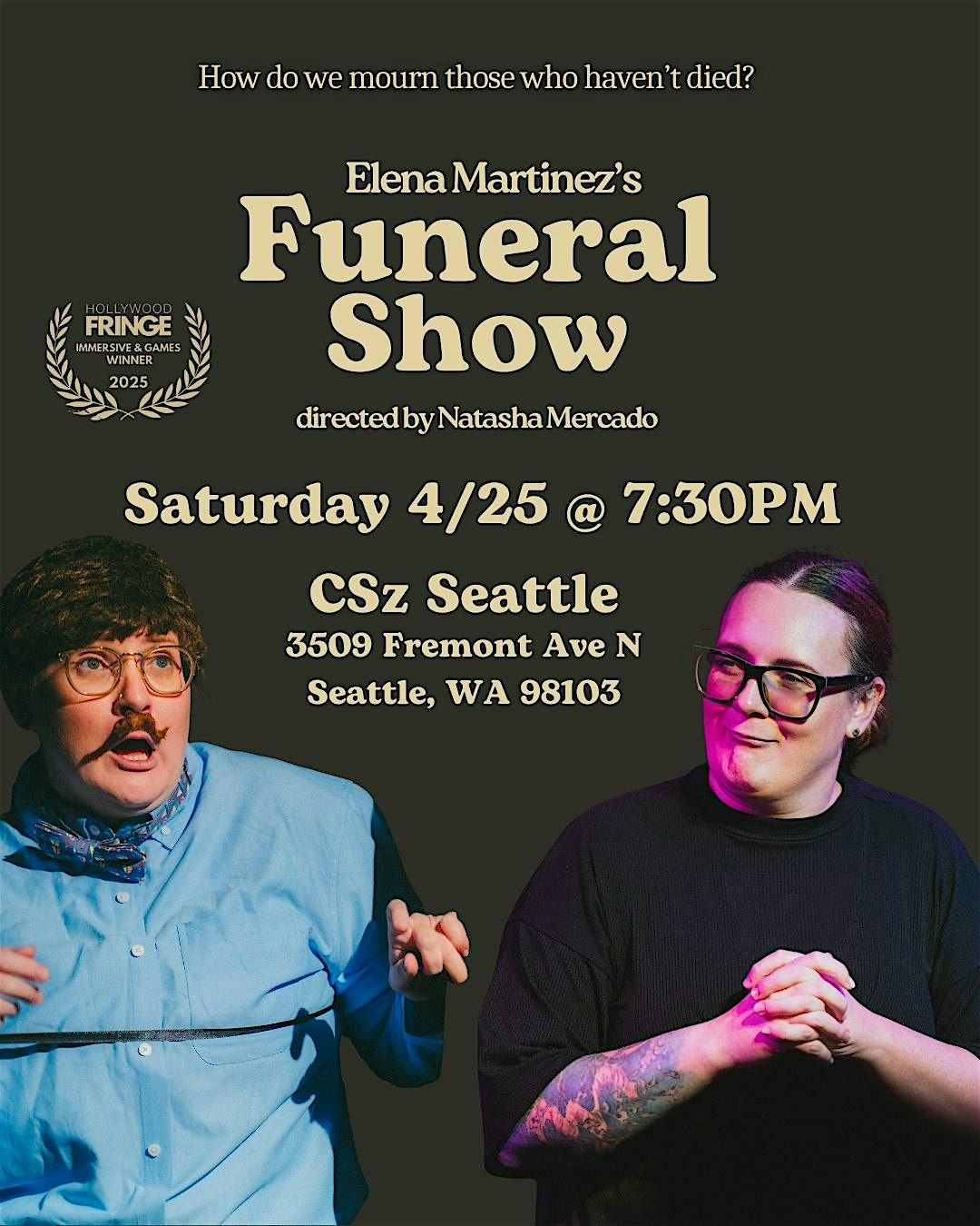 Elena Martinez’s one-woman dark comedy pokes around in the well-known wound of when your parental relationship becomes terminal. You’re all invited to a musical, drag, clown spectacle that seeks closure when your parent is neither gone, forgotten…nor in your life. Celebrate the bygone good times in memory of a life still being lived. Bring your tissues and dress in black, the mourning has begun.