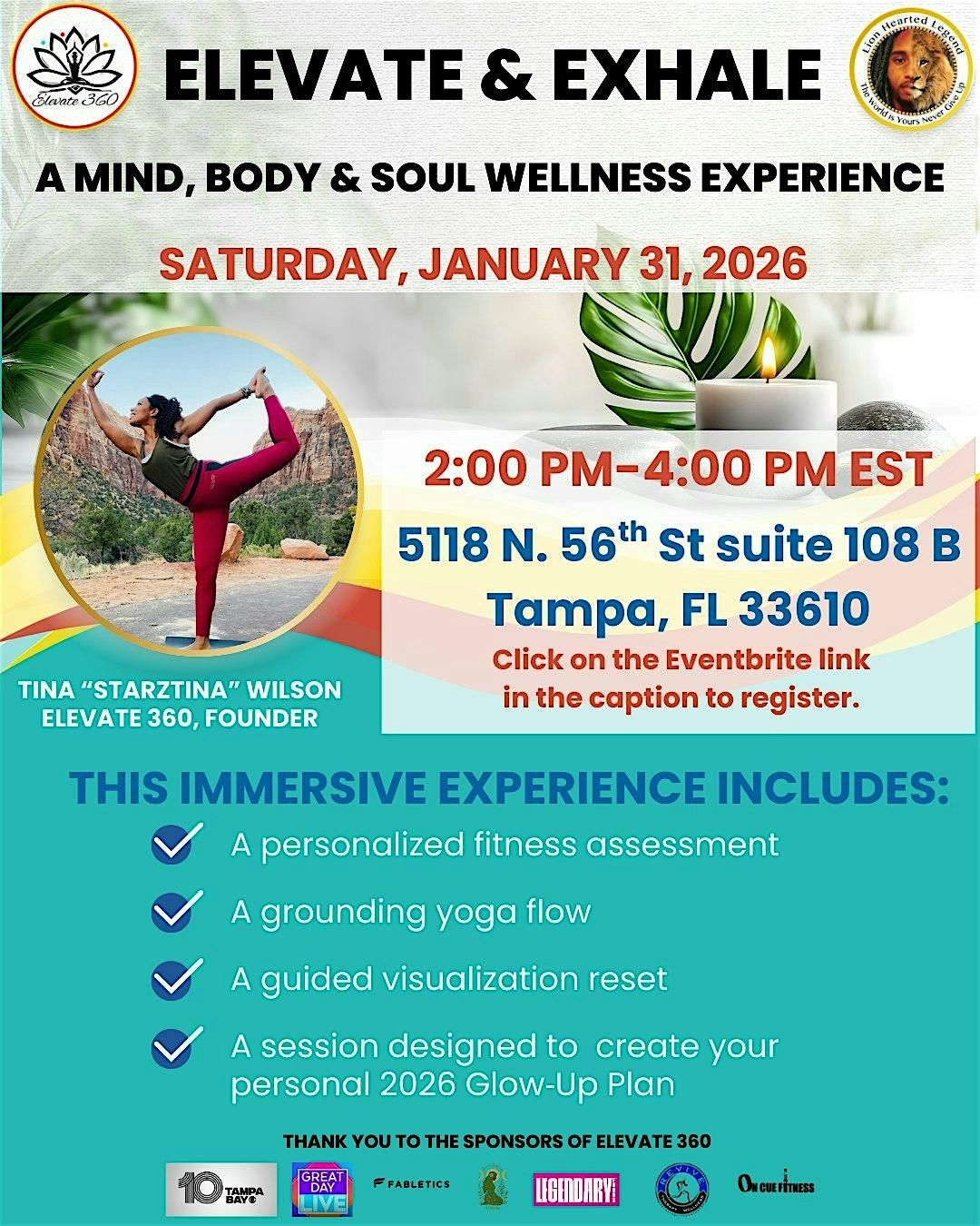 Elevate & Exhale: A Mind, Body & Soul Wellness Experience is a holistic fitness and wellness event designed to help you reset your body, focus your mind, and restore balance. This guided wellness experience blends intentional movement, breathwork, visualization, and reflective journaling to support physical strength, mental clarity, and emotional well-being.