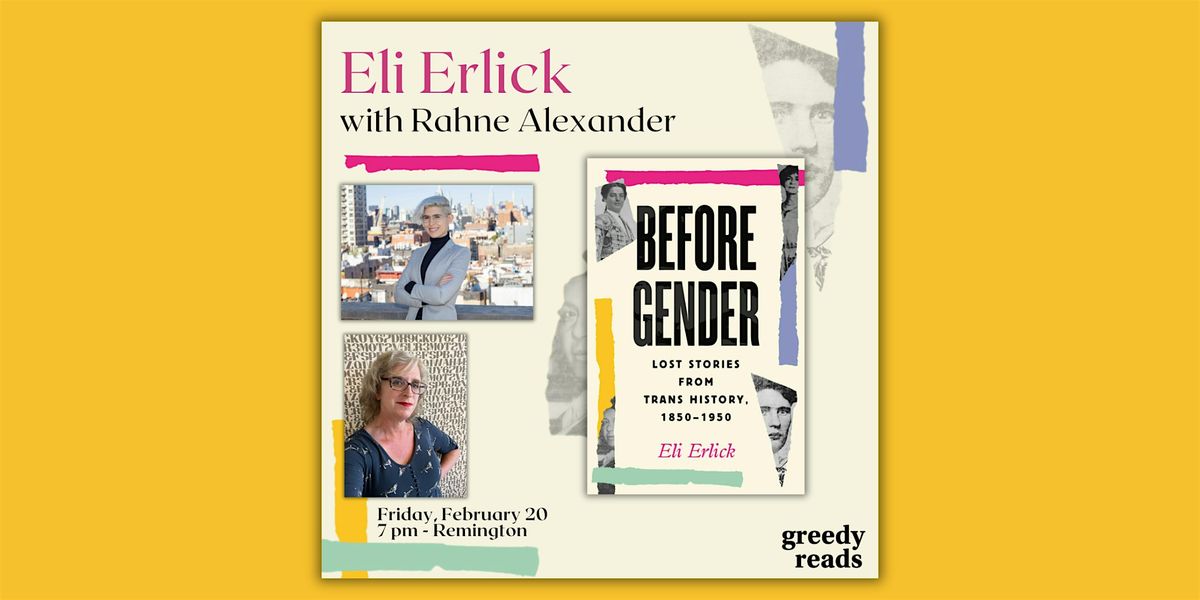 Join us on Friday, February 20, in Remington for a conversation between writers Eli Erlick and Rahne Alexander. They will discuss Erlick's new book Before Gender: Lost Stories from Trans History, 1850-1950.