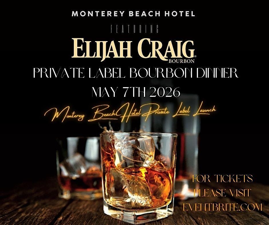 Join us in person for an unforgettable evening at the Monterey Beach Hotel! Savor the rich flavors of Elijah Craig Private Label Bourbon paired perfectly with a gourmet dinner. It's the perfect chance to enjoy great food, great bourbon, and great company all in one cozy spot. Don't miss out on this exclusive bourbon experience!