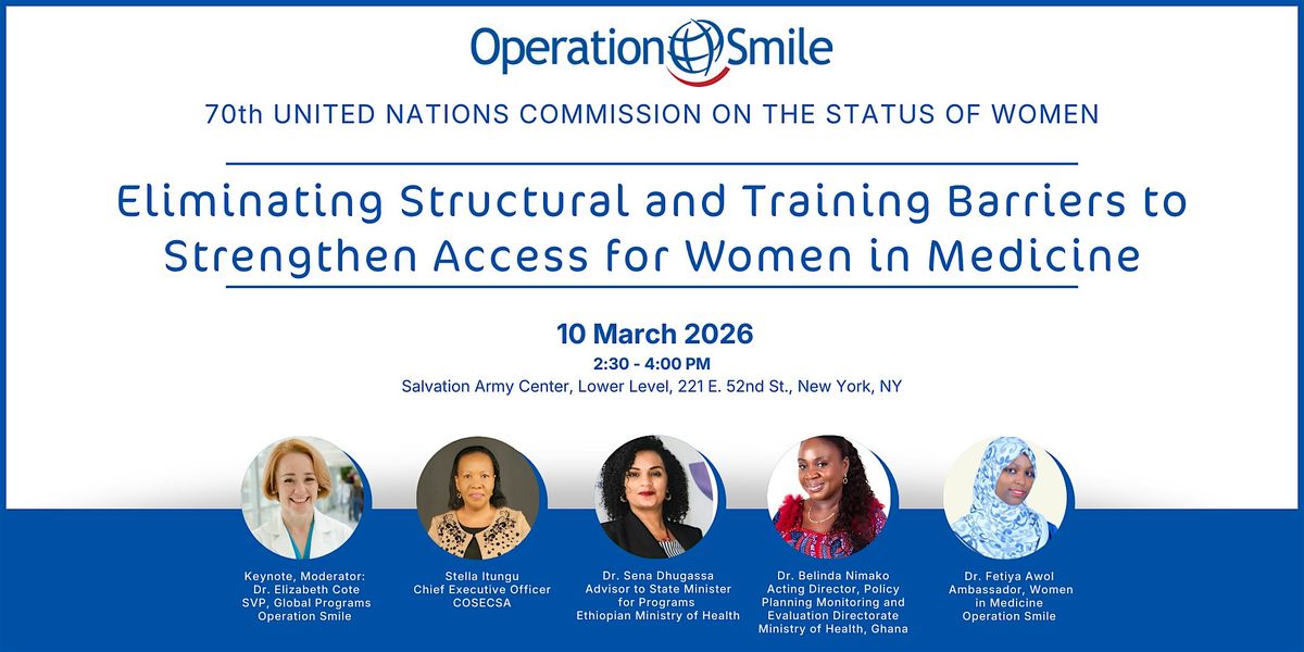 Description: CSW70’s priority theme focuses on “eliminating discriminatory laws, policies, and practices, and addressing structural barriers” Join Operation Smile and partners who have worked to eliminate structural and training barriers faced by women in medicine to help them advance as health care specialists and leaders. Learn about successful interventions implemented by Operation Smile, the College of Surgeons of East, Central, and Southern Africa, and the Ministries of Health of Ghana and Ethiopia to help women enter and excel in health careers. How do you include women in national surgical planning and center them in national health policies? How can you increase female representation in surgical training? How does a ministry support development of female leaders? How can clinical training models be made most accessible? Hear from leaders who have navigated these questions and developed real solutions.