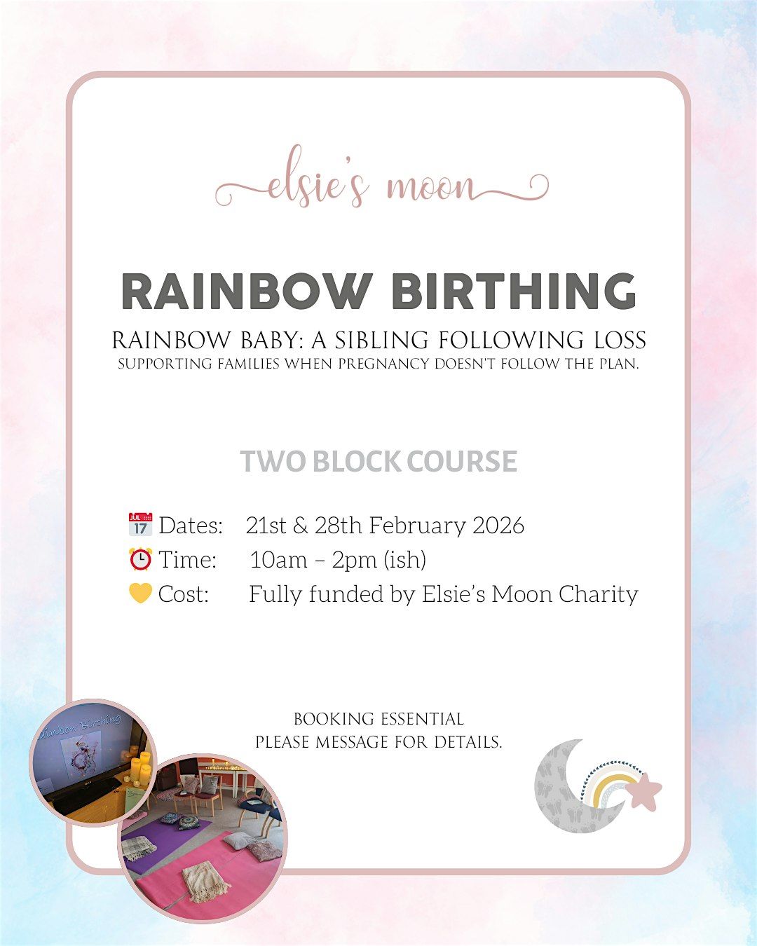 These sessions are fully funded by Elsie’s Moon Charity and are gently led to support you as you prepare for birth after loss.