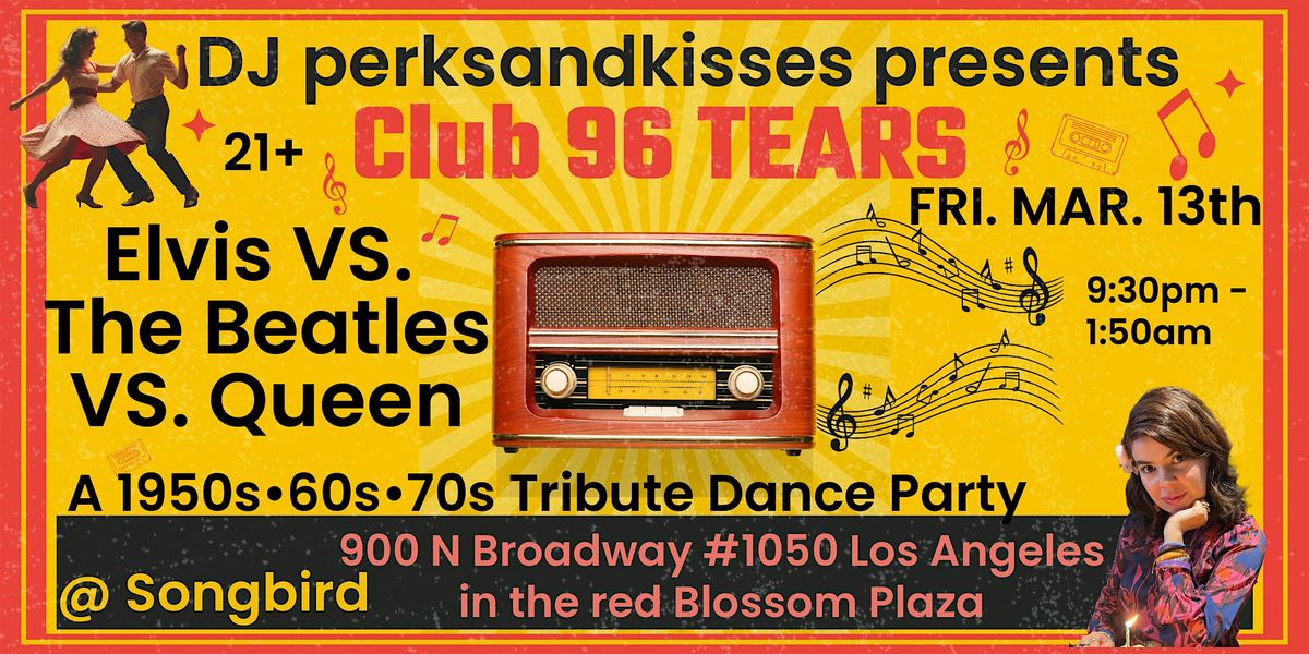 FRI. March 13th, come on down to Club 96 TEARS for a vintage 1950sβ’60sβ’70s tribute dance party! This event's theme is Elvis Vs. The Beatles Vs. Queen. Hosted by DJ perksandkisses @ Songbird in Chinatown Los Angeles!