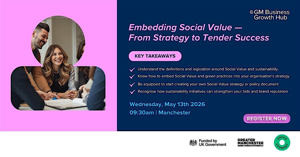 This workshop helps you understand what Social Value really means and how to embed it within your organisation’s strategy to create meaningful impact. You’ll learn how to develop a Social Value Strategy and Policy, explore measurement frameworks, and see best practice examples from Greater Manchester that show how businesses are integrating sustainability and social impact into their operations.