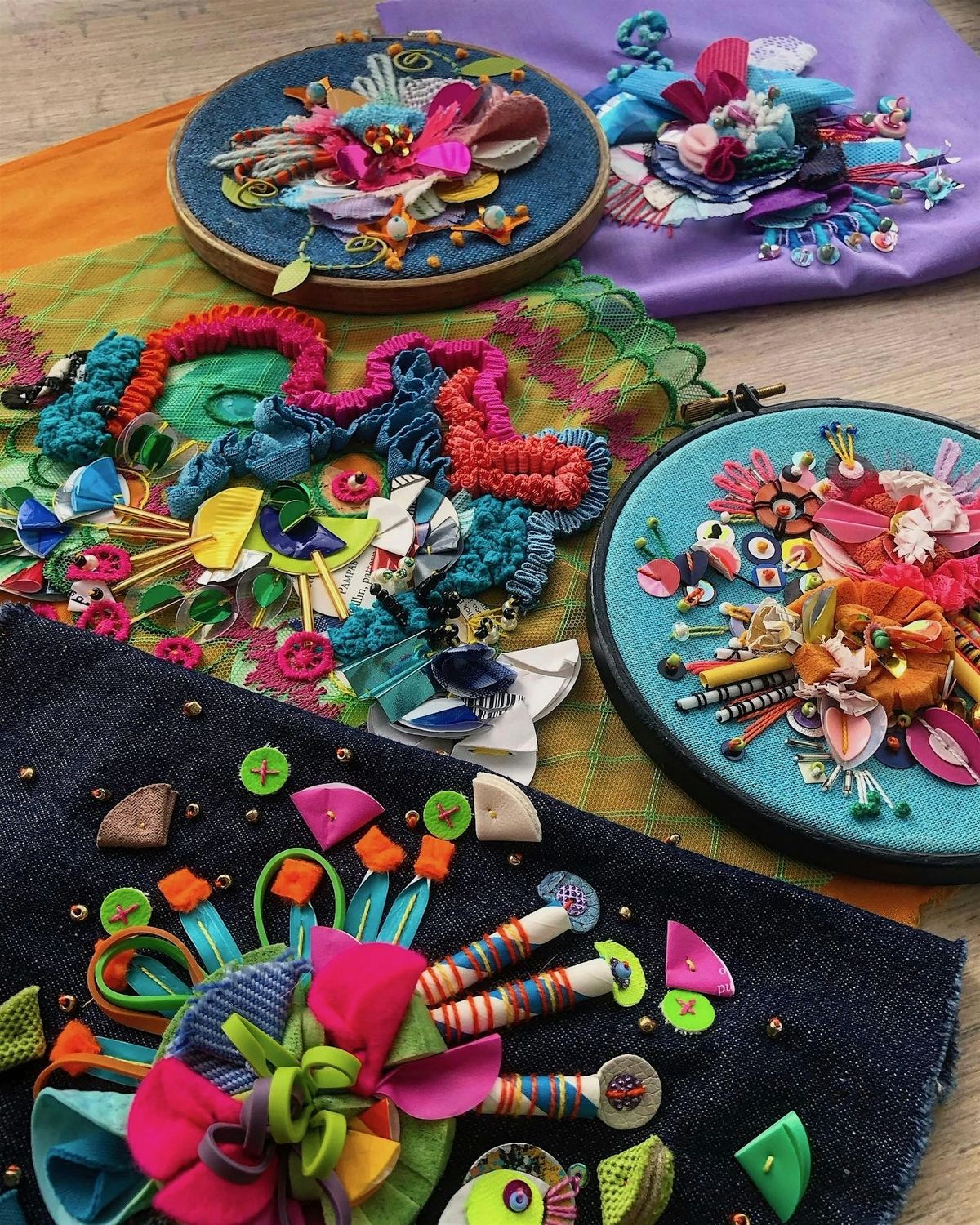 You will be working on your own embellished floral motif design using Jessica's samples and ideas to inspire you. Jessica will show you how you can utlise a range of mixed media materials to create your floral design including recycled sequins, washers and sponges, as well as more traditional beads, buttons and embellishments.