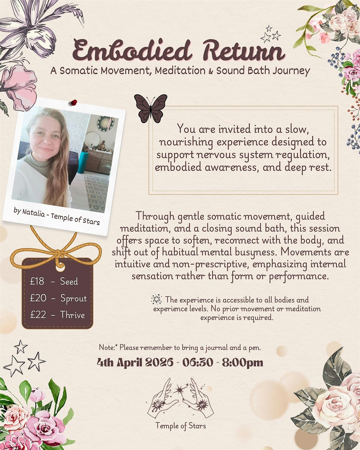 - Those curious about somatic movement or sound healing (no experience needed)