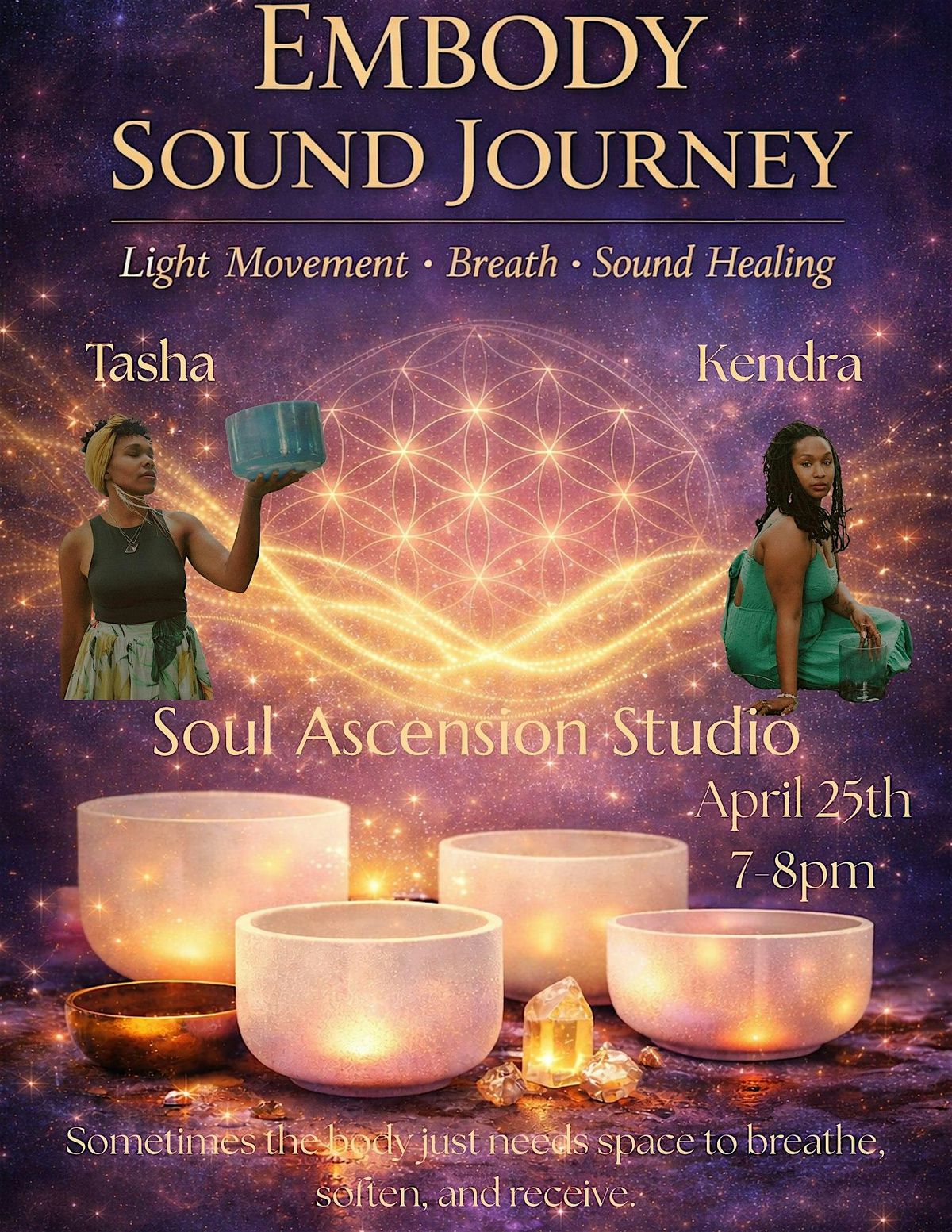 Join Tasha and Kendra for a deeply restorative evening designed to reconnect you with the wisdom of your body through movement, breath, and sound.