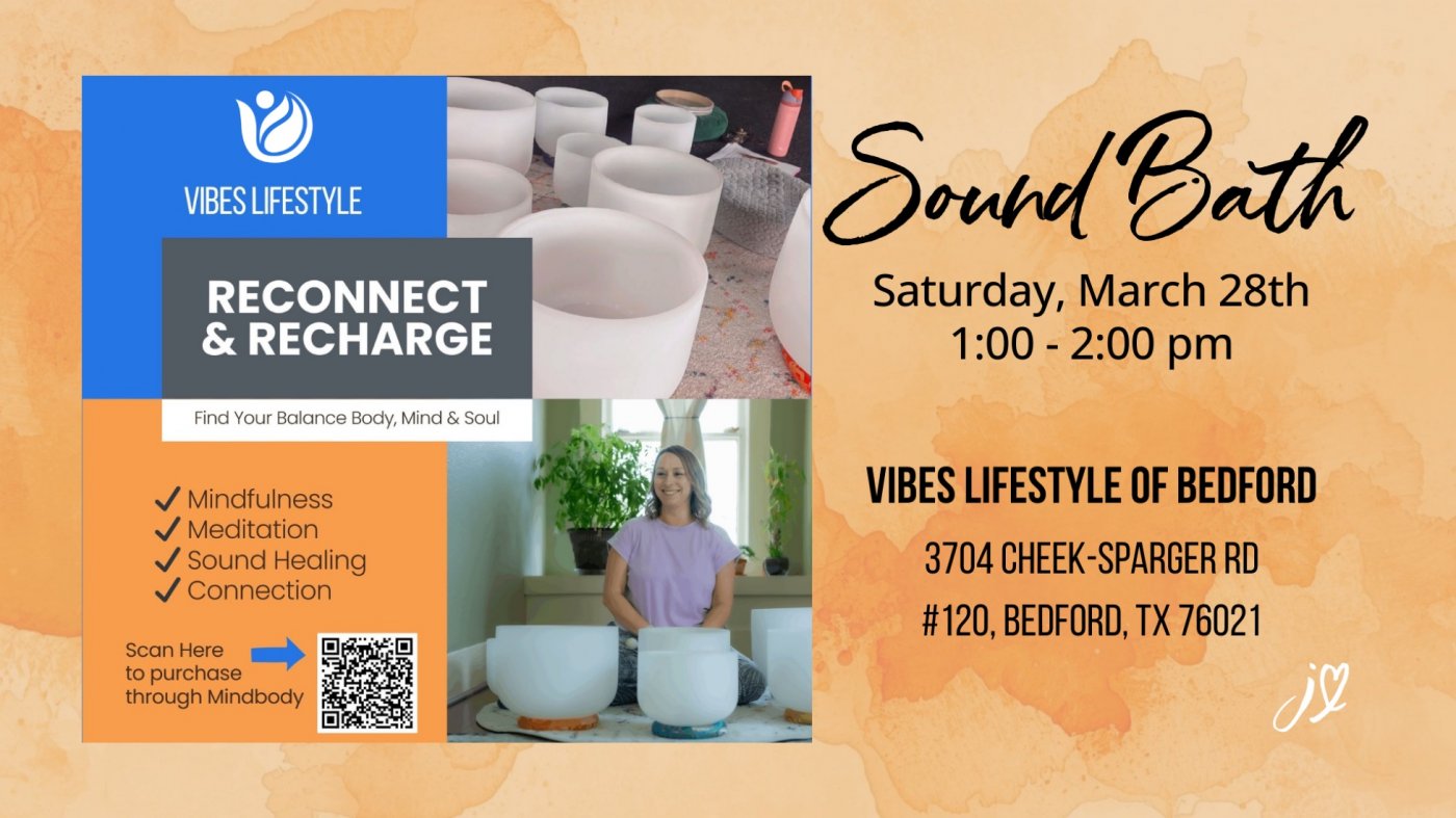 Reconnect and recharge with us at Vibes Lifestyle of Bedford! Join us for a soothing sound bath that will aid in the release and reset of your energy. During the session, you will lie down comfortably as the sounds wash over you, quieting the mind and promoting healing from the inside out.