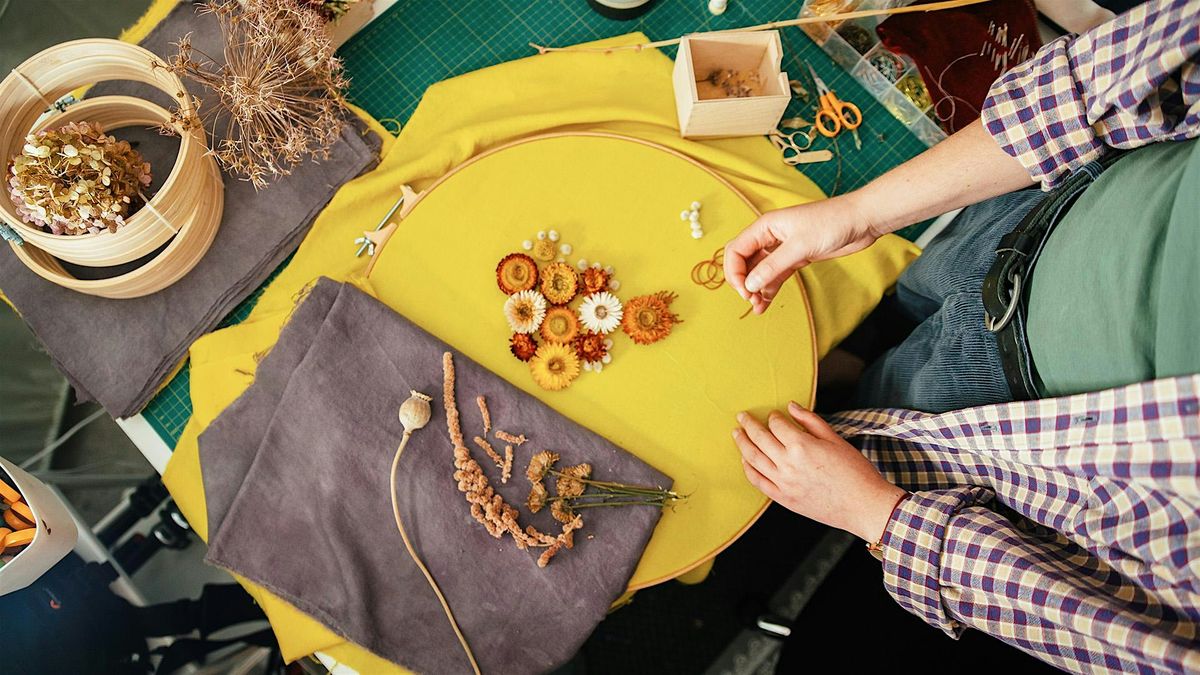 Experiment with dried flowers and natural colours to create your own unique piece of embroidery art, Elnaz Yazdani dries and collects flowers from her allotment, garden, and walks. She also sources dried materials from The Plant Room in Saltire to create her larger artworks. You will learn a range of exciting hand embroidery stitches to apply these elements of nature onto natural fabric using beadwork and hand embroidery.