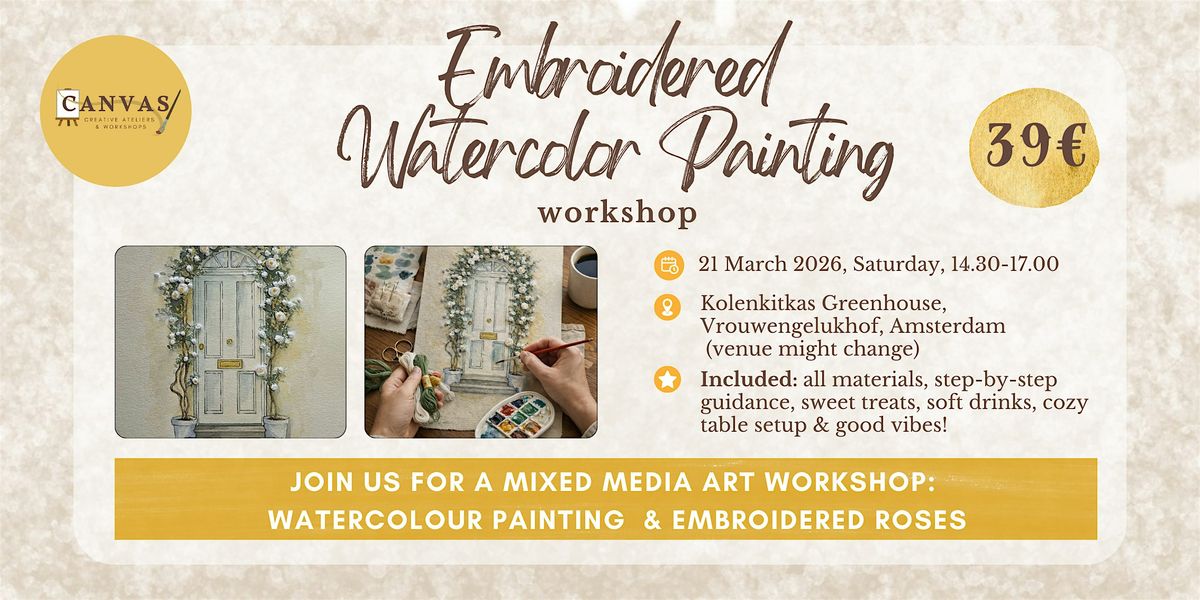 Join us for an elegant Embroidered Watercolor Painting Workshop, where painting and hand embroidery come together in a calm, thoughtfully styled setting. In this mixed media workshop, you will first create a watercolor illustration and then enhance it with embroidery to form delicate, textured roses.