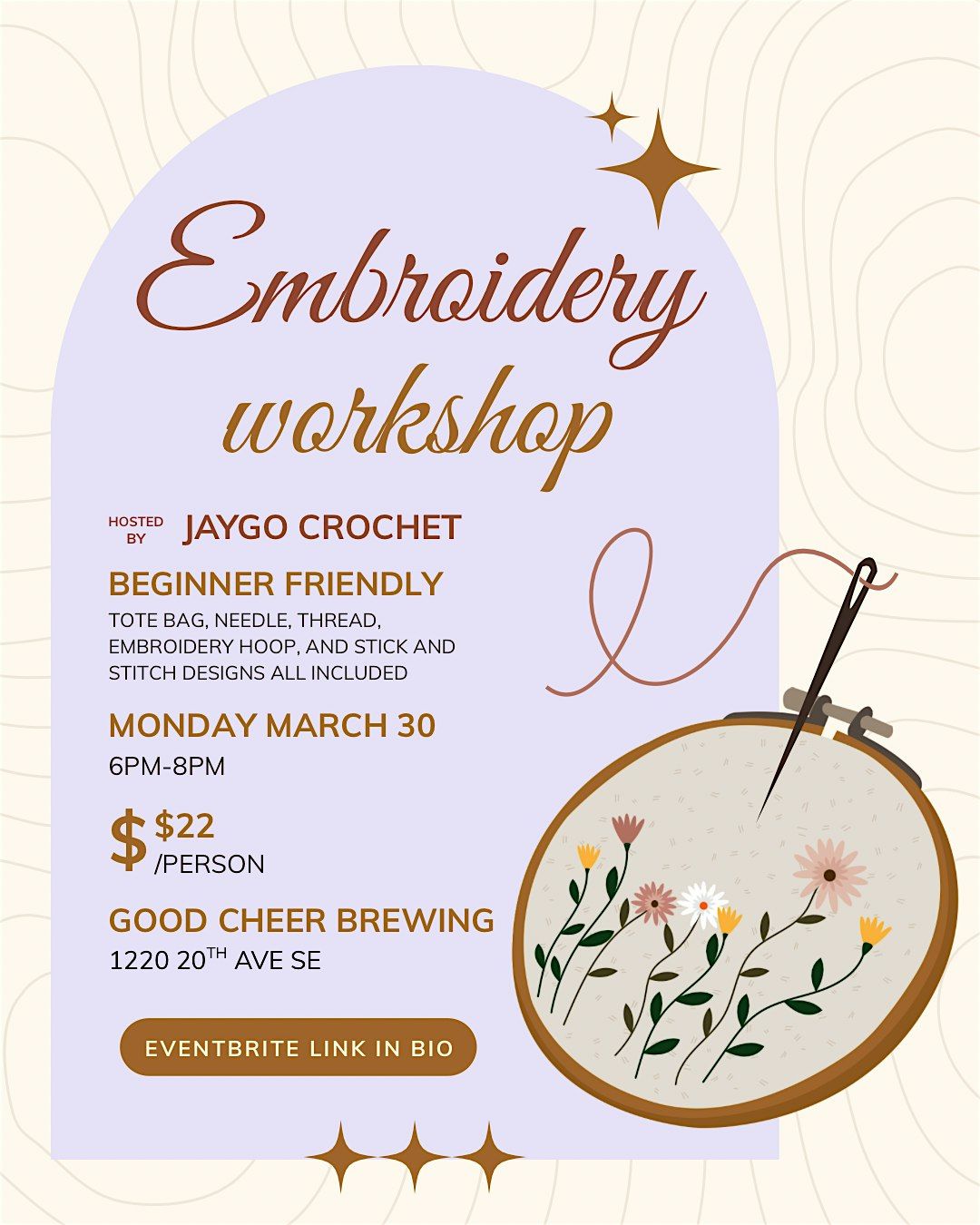Beginner friendly! Tote bag, needle, thread, embroidery hoop, and stick and stitch designs all included.