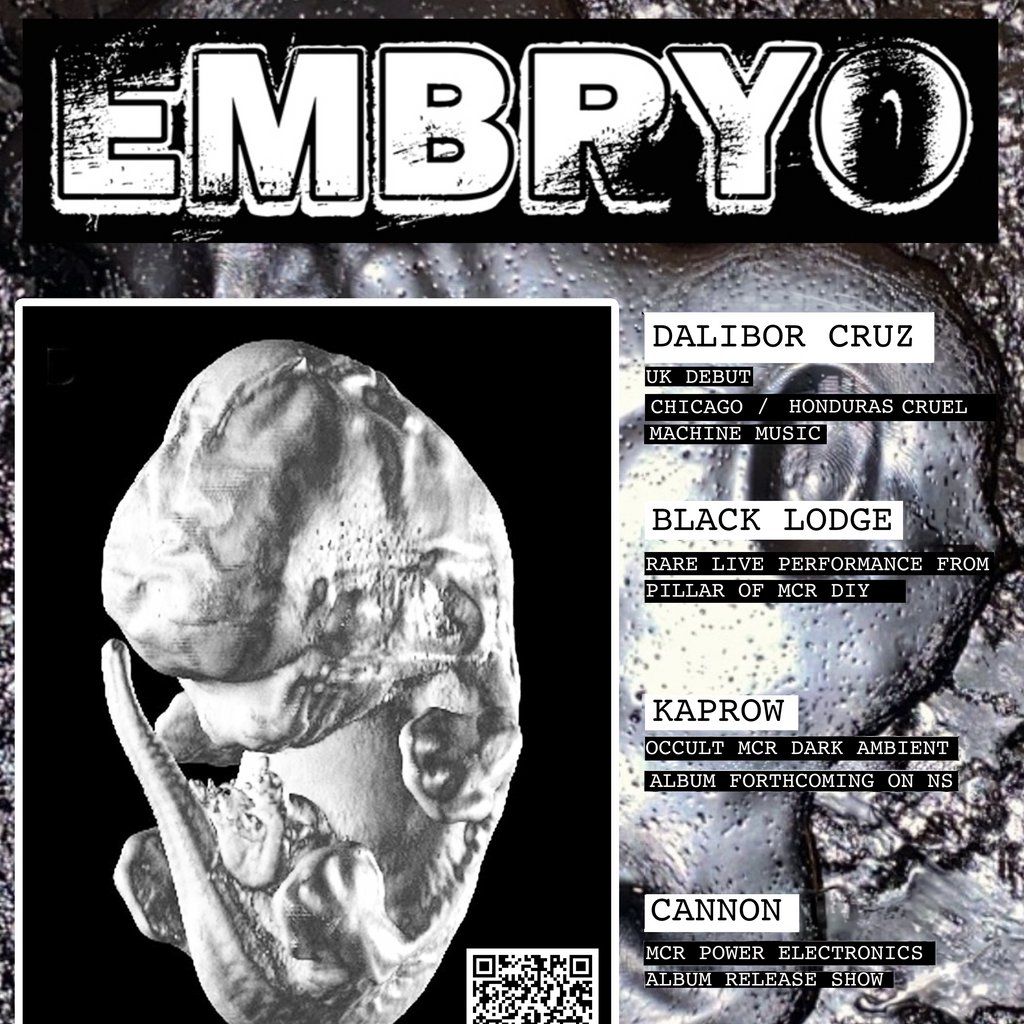 embryo-store.net launch with first UK show from Dalibor Cruz, a rare Black Lodge performance alongside new names in MCR noise + power electronics.