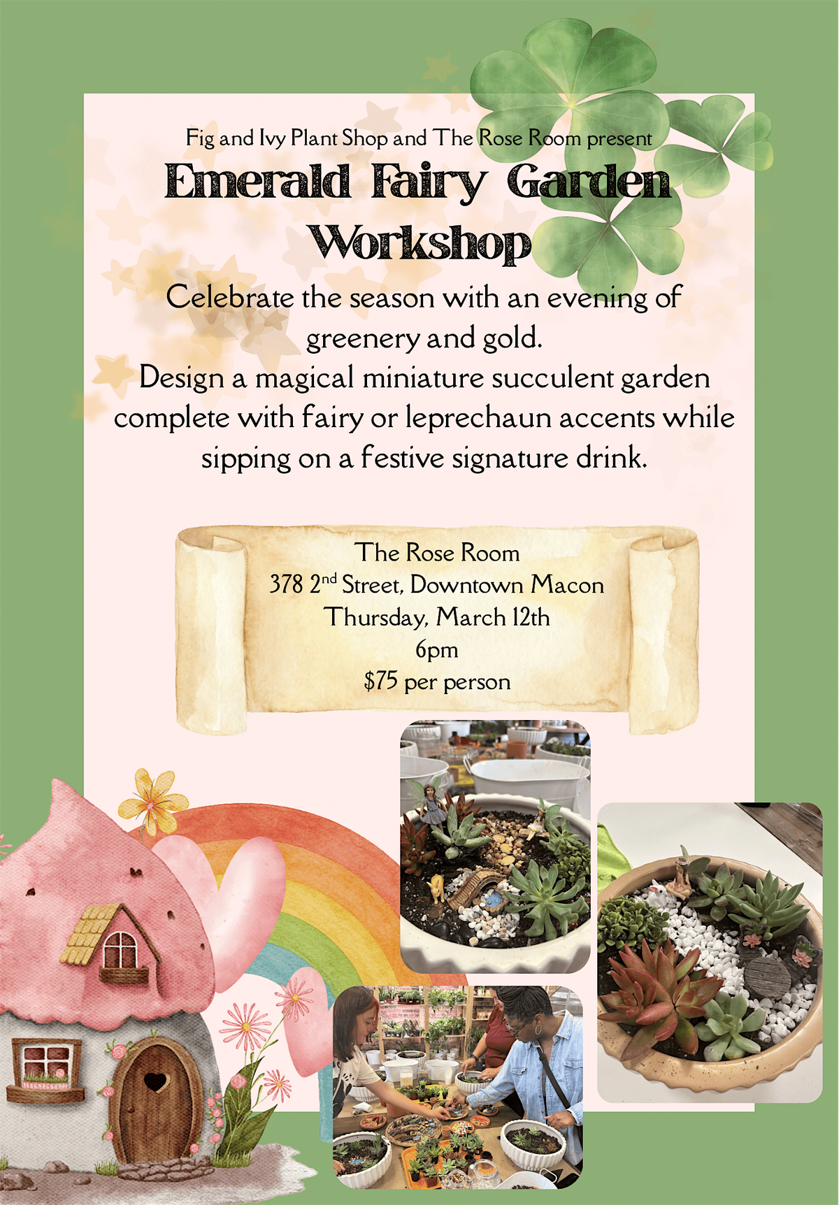 Come join us for a super fun in-person workshop where you'll create your very own magical emerald fairy garden! Get your hands dirty with plants, fairy figurines, and sparkly decorations to build a charming little world right in front of your eyes. Perfect for a relaxing day out or a creative adventure with friends. Don't miss out on this chance to bring a bit of magic home!
