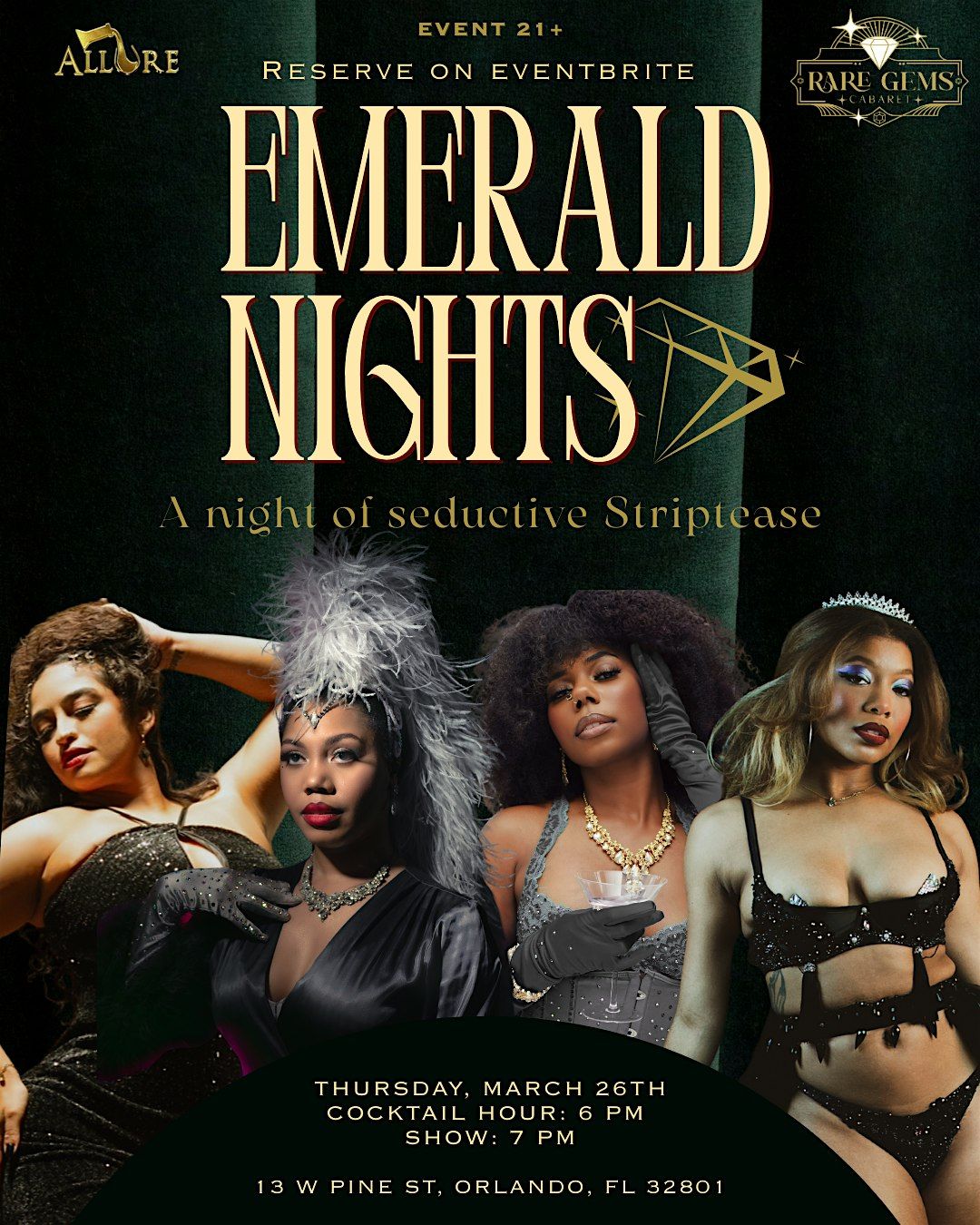 Step into an evening of glamour, mystery, and seduction at Allure Orlando with Emerald Nights – a burlesque showcase presented by Rare Gems Cabaret.
