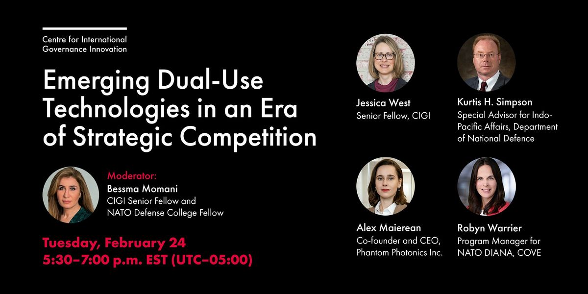 On Tuesday, February 24, 2026, CIGI is pleased to invite you to a hybrid, public panel exploring what these rapidly evolving technologies mean in an era of strategic competition and rising geopolitical tensions. Moderated by CIGI Senior Fellow Bessma Momani, this one-hour panel discussion will feature insights from experts on the opportunities and risks posed by emerging dual-use technologies — audience Q&A will follow.
