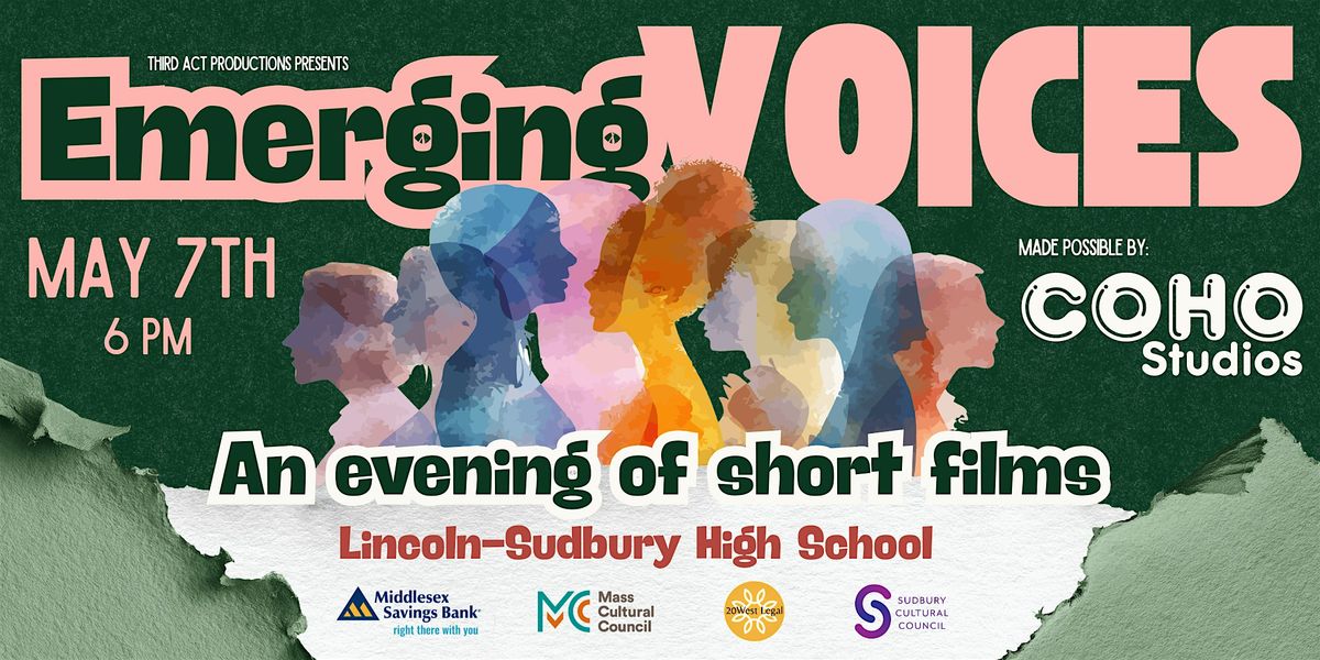 “Emerging Voices: An Evening of Short Films” is made possible through the generous support of our community business sponsors, COHO Studios, 20West Legal and Middlesex Bank. This program is also supported in part by grants from the Southborough, Sudbury, Lincoln, Concord, and Carlisle Cultural Councils—local agencies funded by the Mass Cultural Council, a state agency.