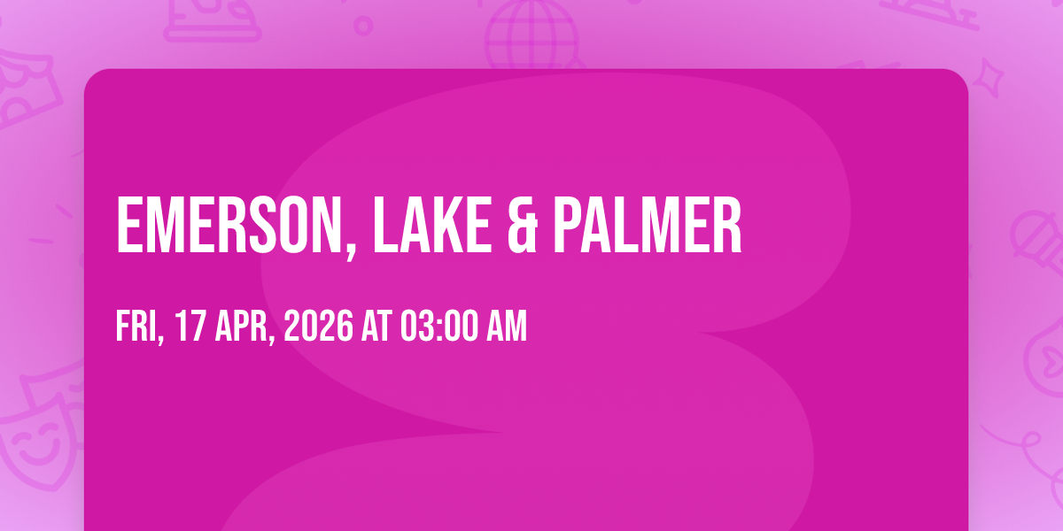 📍 Location: 35.2819, -120.661✨ Discover the extraordinary at Emerson, Lake & Palmer, where magic meets reality in ways you've never imagined! 🏛️ Set in Fremont Theater - San Luis Obispo nestled in bustling San Luis Obispo, CA, this event promises to be a landmark occasion. 📅 Taking place on April 17th, 2026 at 03:00 AM, it's going to create an atmosphere where every moment becomes a cherished memory. 🌟 Immerse yourself in an experience crafted with attention to every detail, designed to surprise and delight at every turn. They have worked tirelessly to ensure this event exceeds all expectations, bringing together elements of entertainment, innovation, and pure joy. 🎊 Don't miss your chance to be part of this remarkable journey!