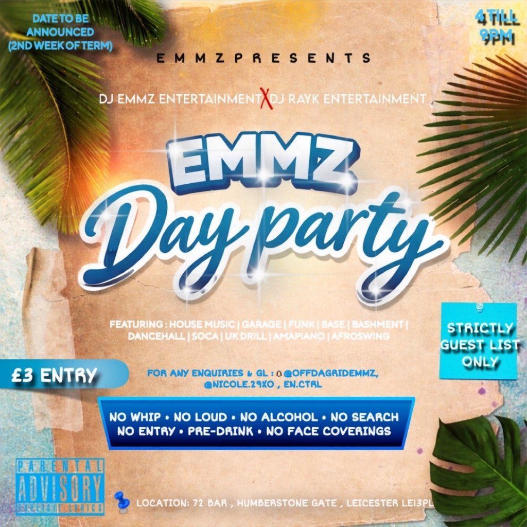 Leicesters ultimate day part at 72 Bar! Pull up with your crew and catch the energy! Featuring DJ RAYK & DJ EMMZ!! (strictly gl)