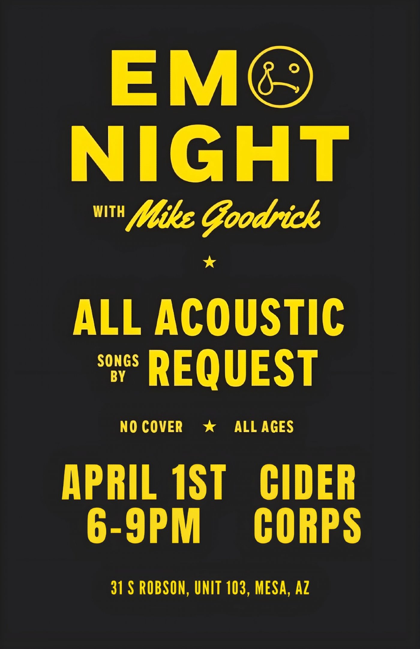 Who said angst can't be refined? Mike Goodrick is transforming Cider Corps into a haven for acoustic angst and great drinks. Come get your mid-week catharsis! We're singing loud, requesting hard, and embracing the angst from every era of the scene. It's the perfect combination: powerful, emotional songs performed live in an intimate setting. Grab a cider and let the lyrics finally say what you can't.