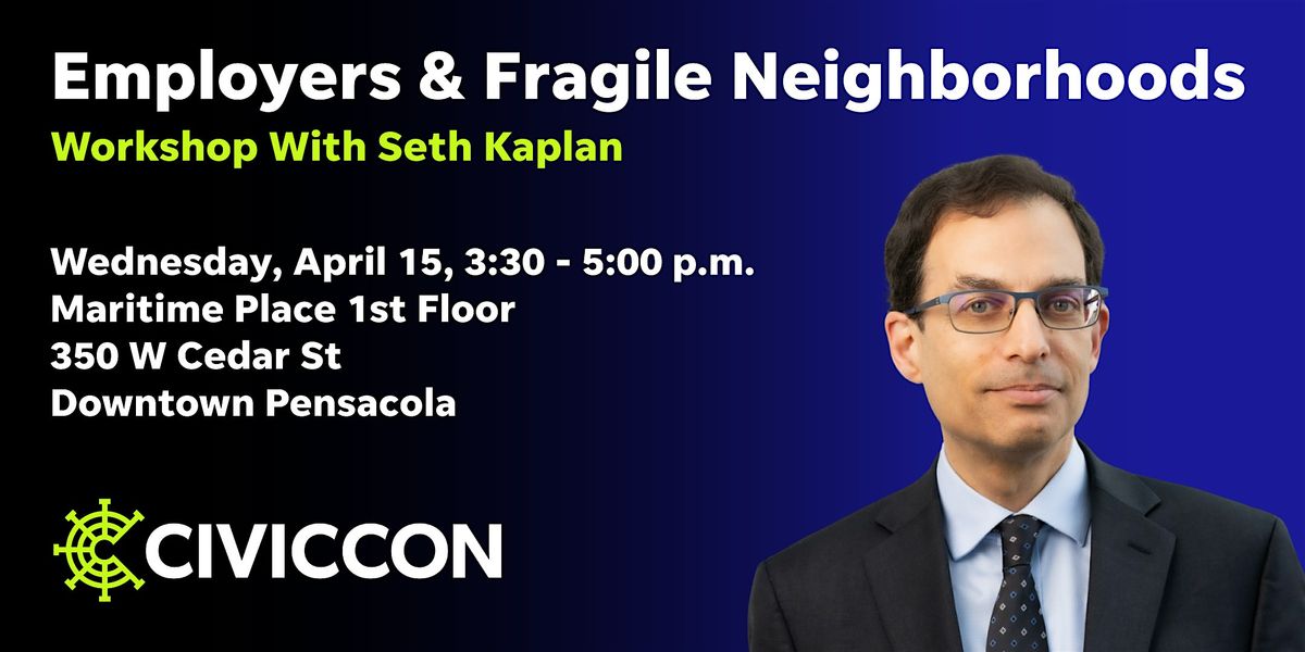 Seth Kaplan will also be delivering a free public CivicCon presentation in Pensacola on Tuesday, April 14 (Register for that here). This session offers a more focused setting for business leaders to engage directly with the ideas from Fragile Neighborhoods and apply them to their work.