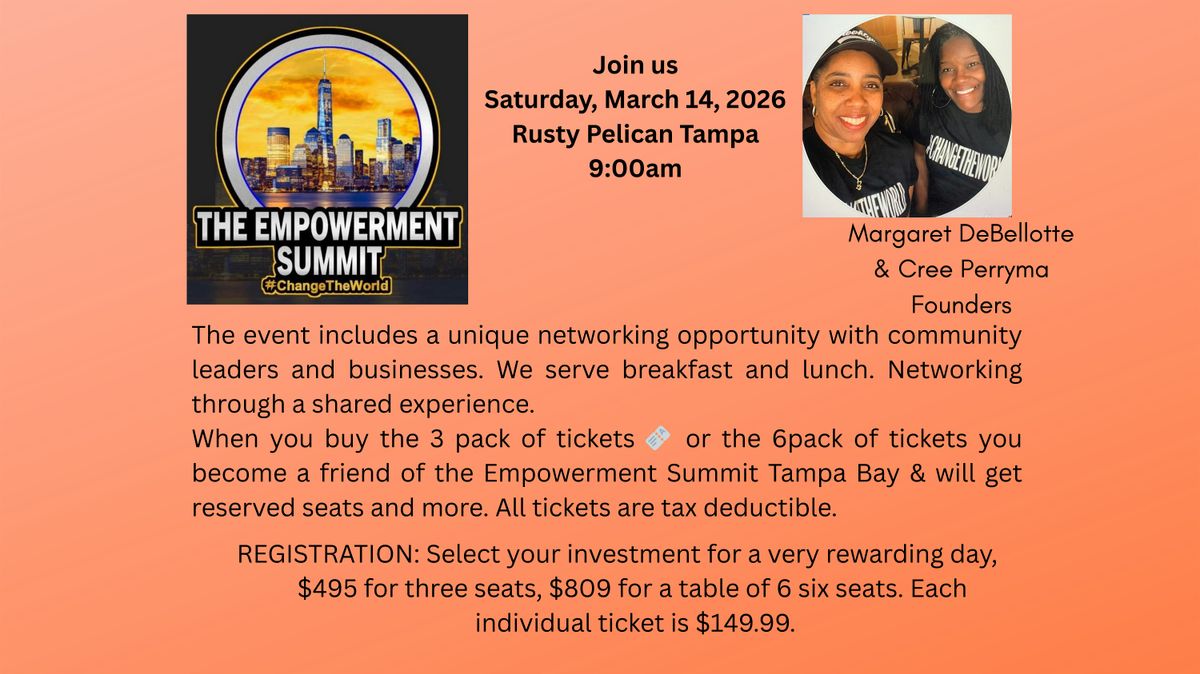 Empowerment Summit Tampa Bay & will get reserved seats and more. All tax deductible.