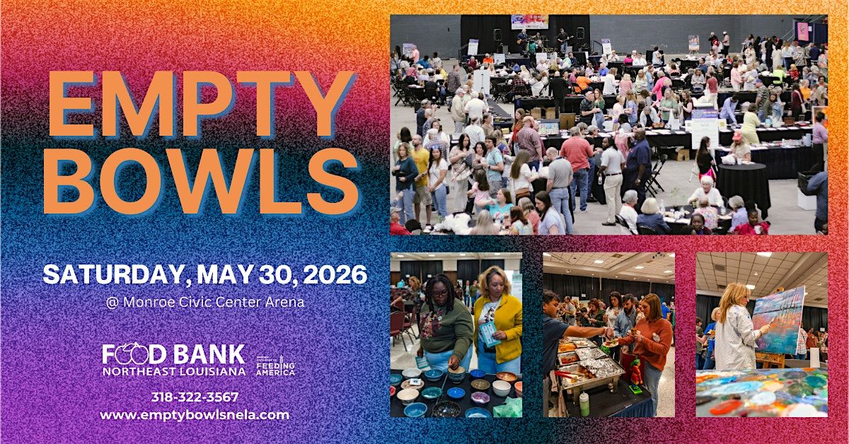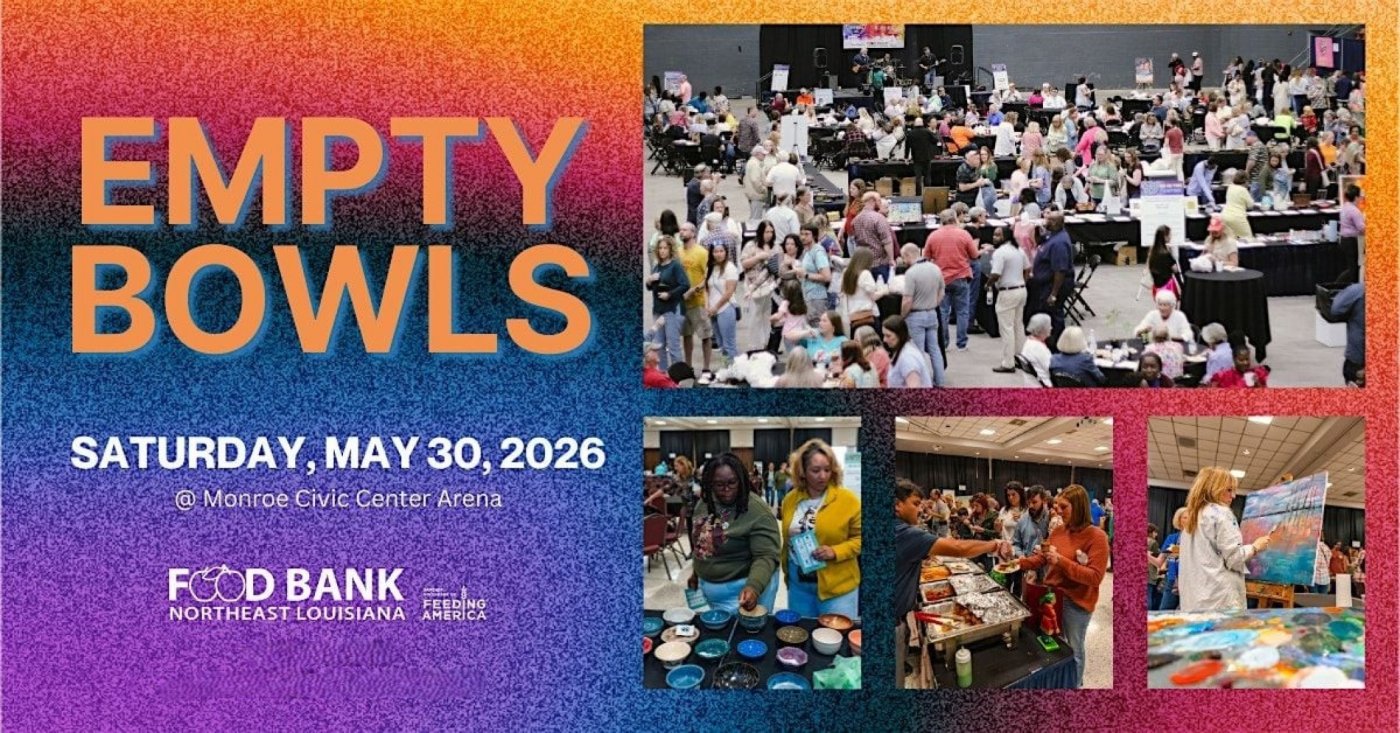 Join us for the Food Bank of Northeast Louisiana’s 10th Annual Empty Bowls on Saturday, May 30, 2026, at the Monroe Civic Center, a beloved community tradition that brings people together to fight hunger.