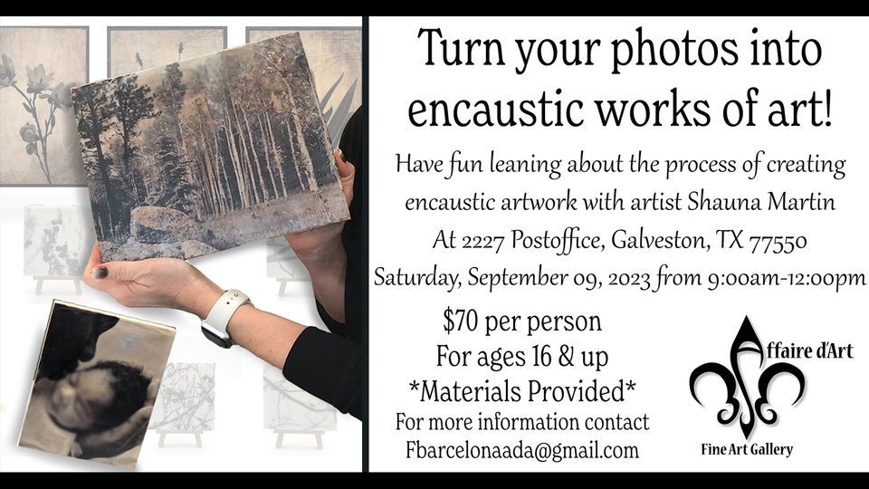 Learn to paint with wax with local artist Shauna Martin. Leave this workshop with two of your very own encaustic works of art on wood!In this specialty workshop, you’ll be using your own black and white photos and tissue paper of all colors to create beautifully layered compositions! ALL supplies included. We have plenty of supplies here but you are welcome to bring more; your favorite tissue paper (plain or pattern); favorite writings, quotes, poems, magazine cutouts, hand-made papers, fabric, etc. Basically, if you like scrapbooking or journaling, this workshop is for you! To save time, email two of your favorite B&W images to Shauna and she will have it printed for you and ready to go for class. Don’t worry, Shauna will also walk you through the entire printing process so that you can easily continue this exciting medium in your own home.