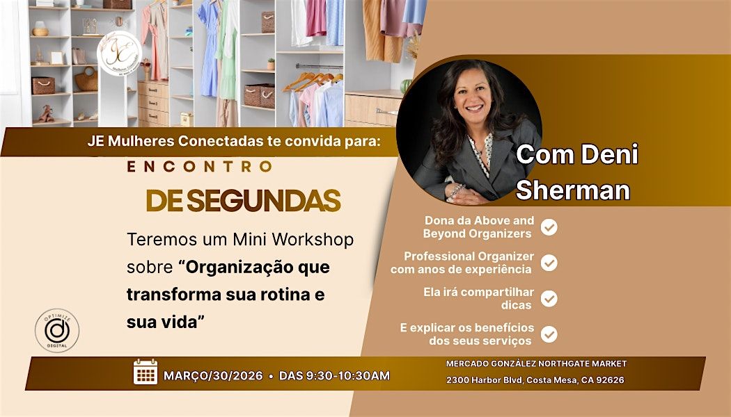 Nesta edição especial do Networking de Mercado, vamos receber a profissional Deni Sherman, Personal Organizer, que vai compartilhar estratégias práticas para organizar seu dia a dia, aumentar sua produtividade e trazer mais clareza para sua rotina e seu negócio.