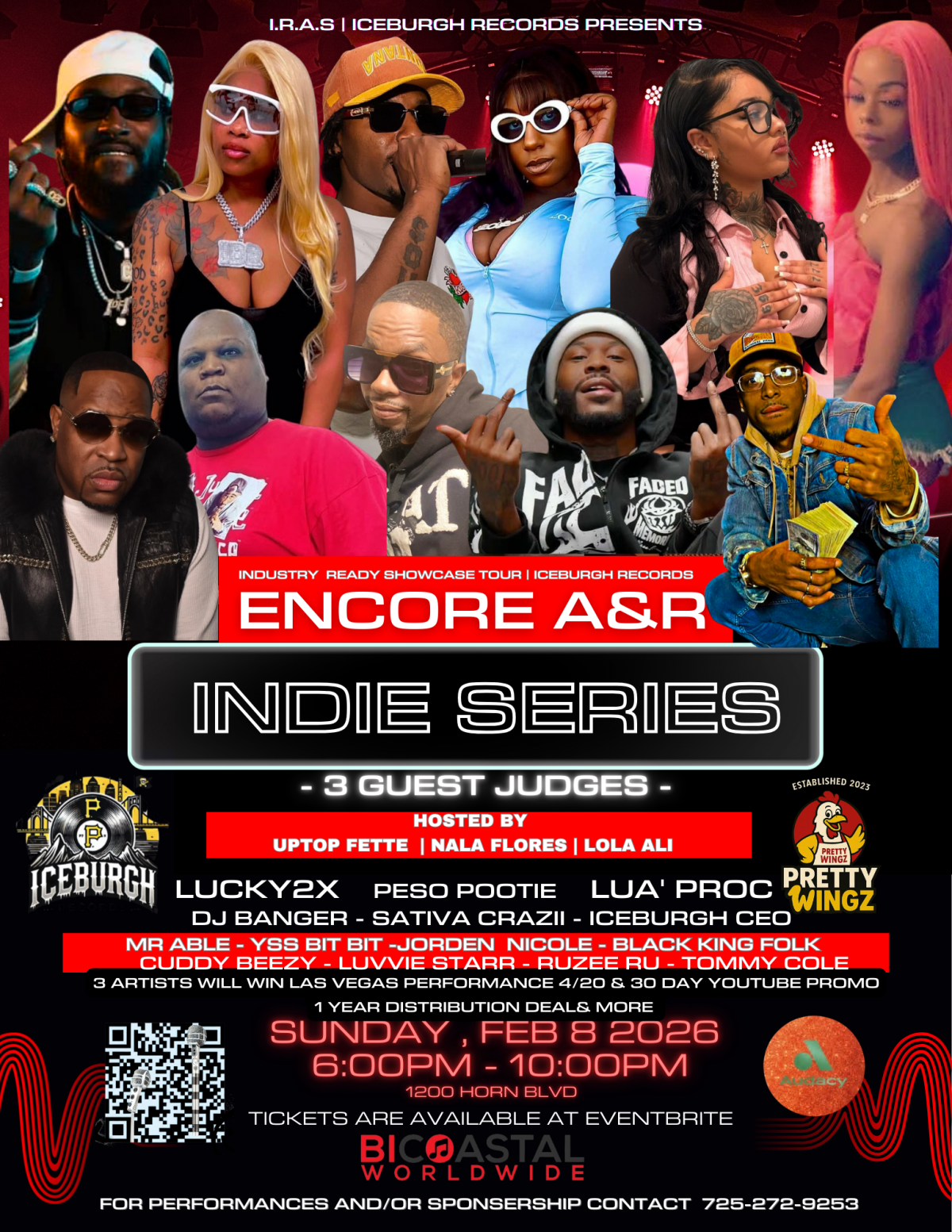 Encore A&R Indie Series hosted by Uptop Fette, Nala Flores, and Lola Ali with 3 guest judges. Featuring performances by Lucky2X, Peso Pootie, Lua' Proc, and others.