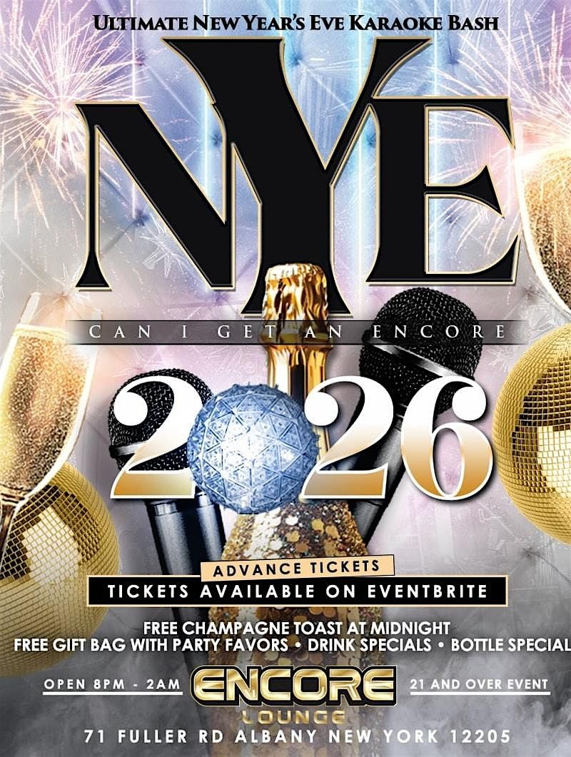 Welcome to Encore's "Can I Get An Encore" NYE BASH at ENCORE LOUNGE! Get ready to ring in the New Year in style on December 31, 2025 at 8:00 PM (Eastern Time). Join us for a night of unforgettable music, dancing, and celebration with friends old and new. Let's make memories that will last a lifetime! See you there!