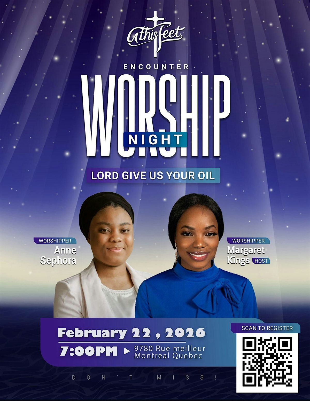 Come join us for a powerful night of worship from all over the place of Great Montreal! Let's gather together to lift our voices and hearts in praise. This event is all about encountering God's presence in a special way. Whether you're a seasoned worshipper or just curious, you are welcome to come as you are. Expect a night filled with music, prayer, and God's word. Don't miss out on this opportunity to connect with God and grow in your faith. We can't wai to welcome you!
