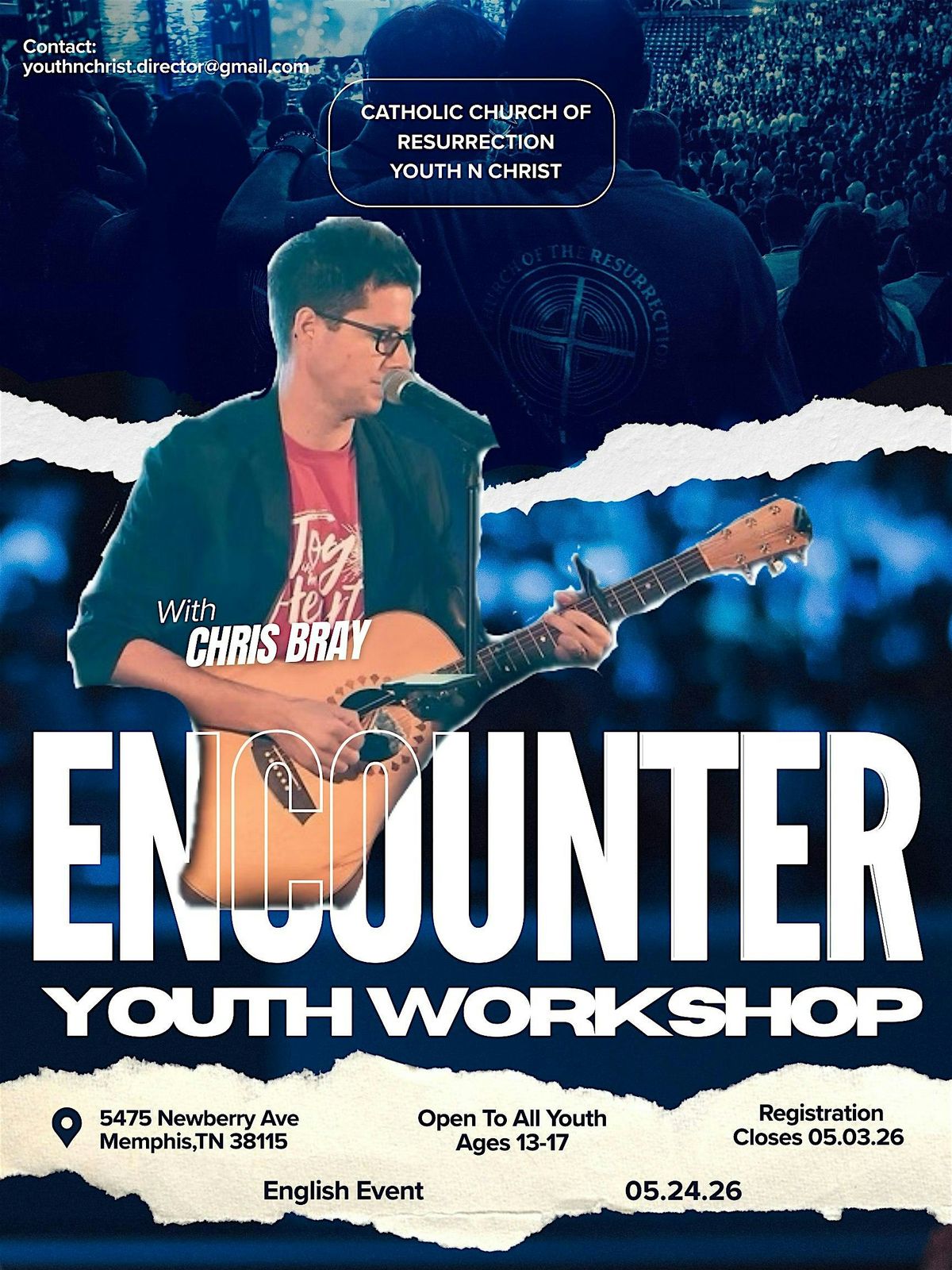 Join us in person for Encounter, a youth workshop hosted by the Youth N Christ /Catholic Church of the Resurrection! It's a great chance to connect, learn, and have fun with other young people. Don’t miss out on this awesome opportunity to grow and engage!