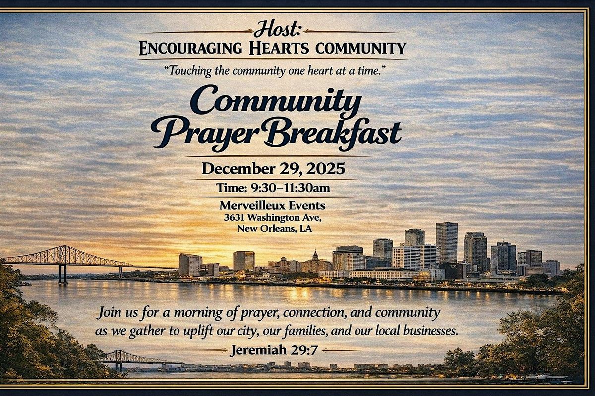 Gather with Encouraging Hearts Community for a meaningful community prayer breakfast as we come together in unity, prayer, and encouragement. This gathering is designed to uplift New Orleans, strengthen families, and support local businesses as we seek the well-being of our city.
