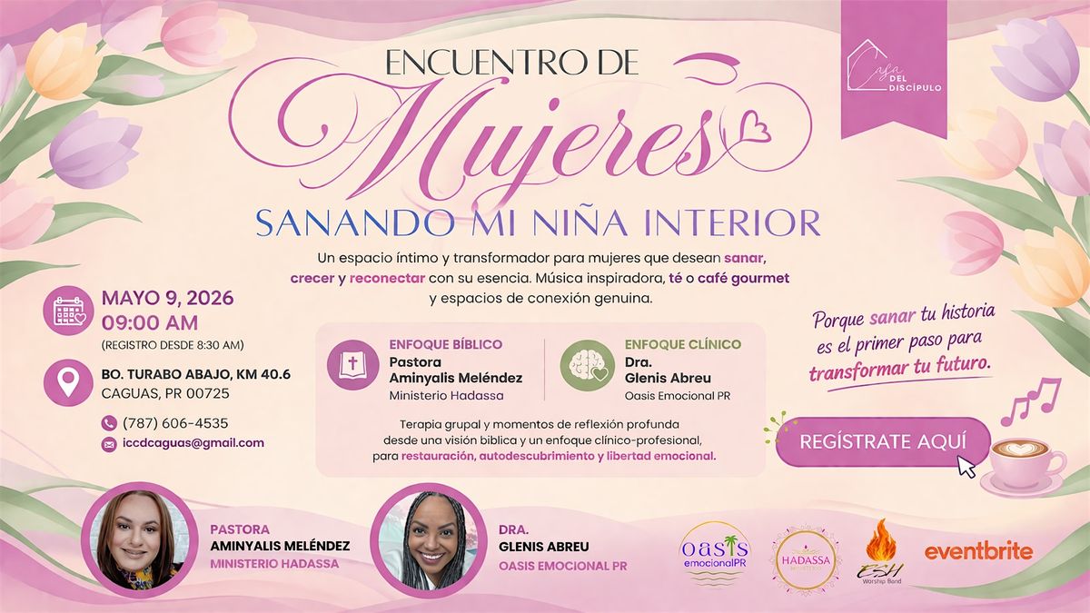 Este tiempo especial incluirá terapia grupal y momentos de reflexión profunda, donde abordaremos la sanidad de la niña interior desde dos perspectivas poderosas: una visión bíblica, guiada por la pastora Aminyalis Meléndez y un enfoque clínico y profesional desde la salud mental, facilitado por la doctora Glenis Abreu.