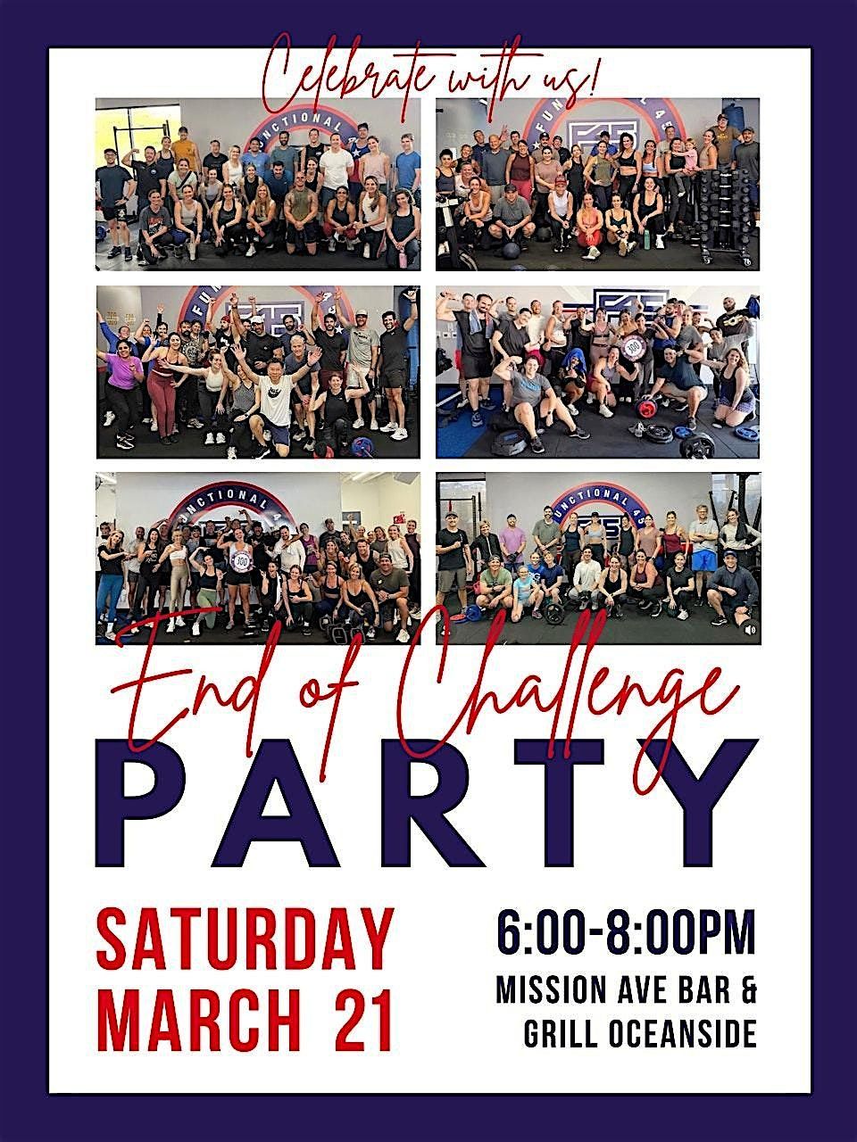 Hey Team! Let's celebrate the dedication and hard work of our challengers! Challenge winners will be announced, and drinks are on us for the first 50 people! Please RSVP if you plan to attend so the owner, Cam can reserve a spot for you and your guest if you're bringing a friend.