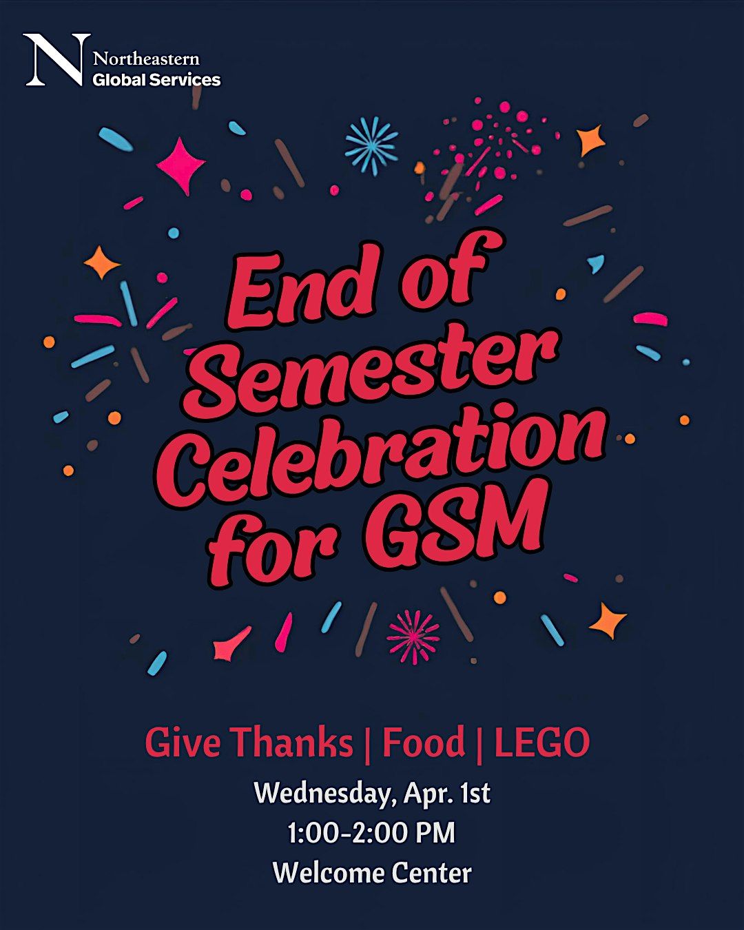 Join us to celebrate the end of the semester with LEGO's, food and fun!